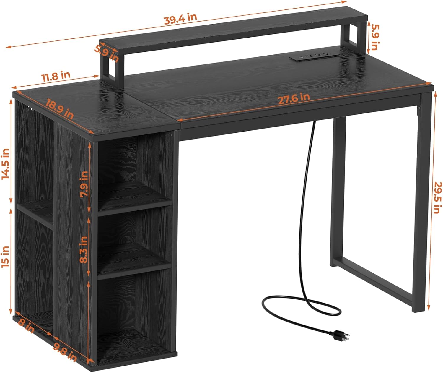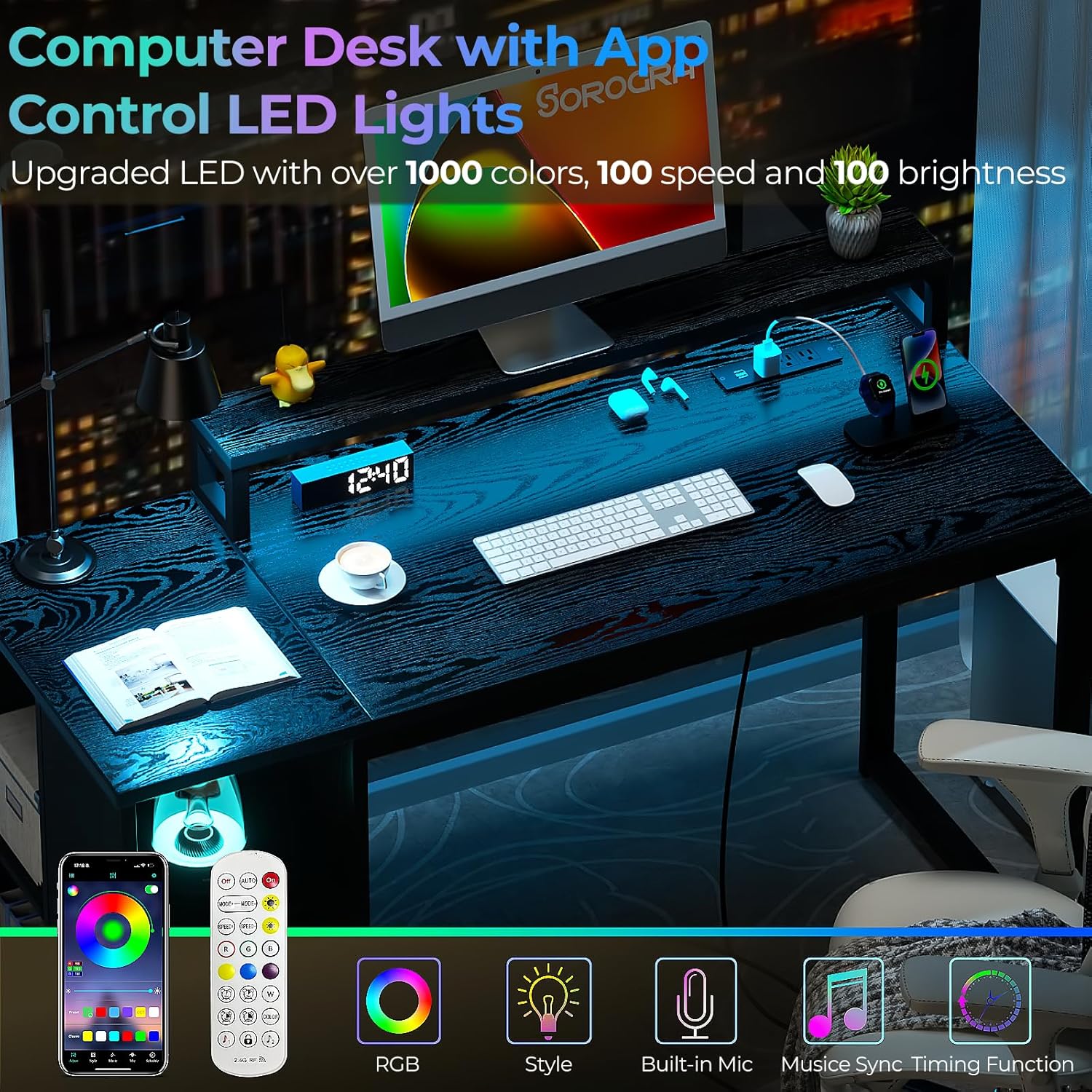 39.4 inch No Assembly Required Folding Desk and Computer Desk with LED Lights and Power Outlets