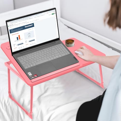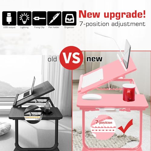 Plus XL Adjustable 17in Laptop Desk with Light, USB Port, iPad Holder, Drawer Storage - Larger 23.6IN Adjustable Lap Desk for Bed, Home Office, Breakfast Tray, Fordable Legs Desk (Pink)