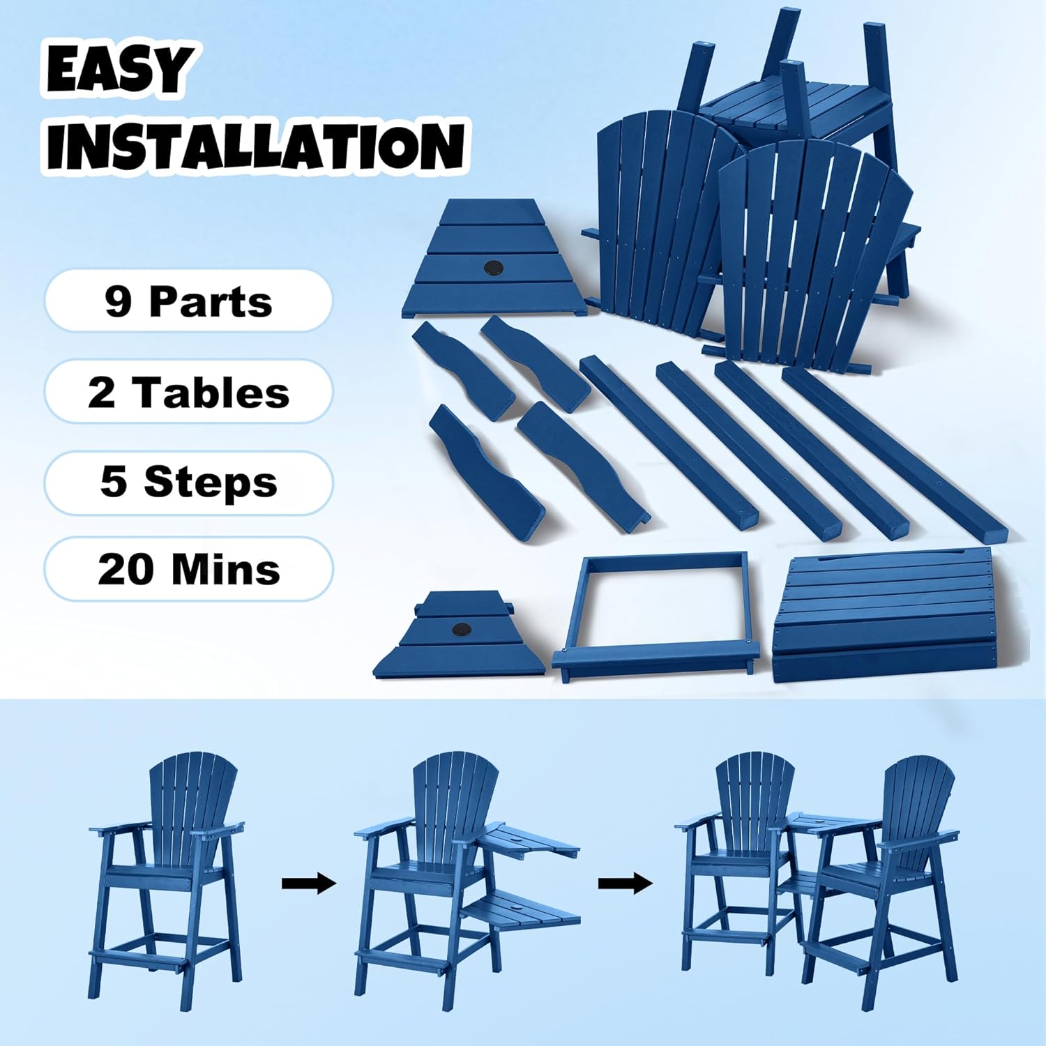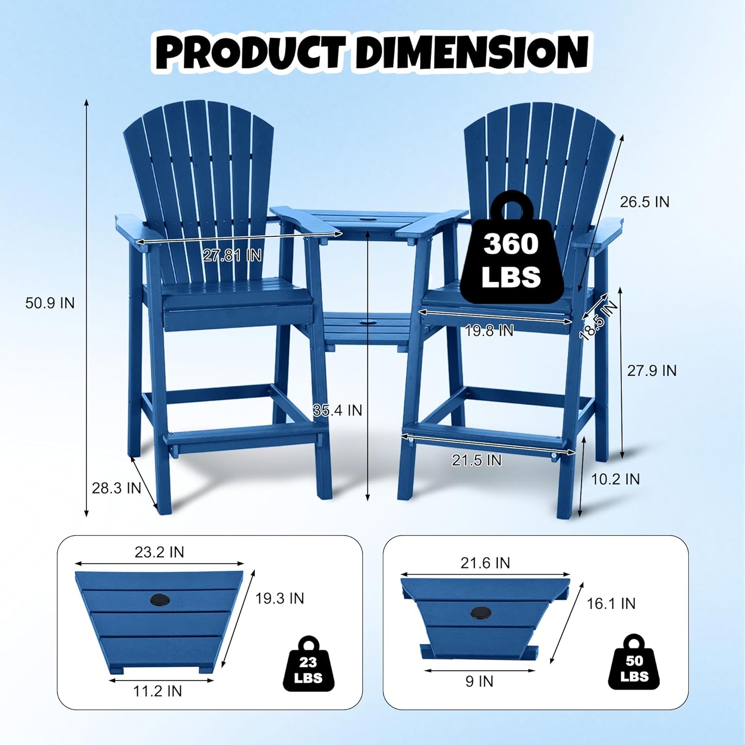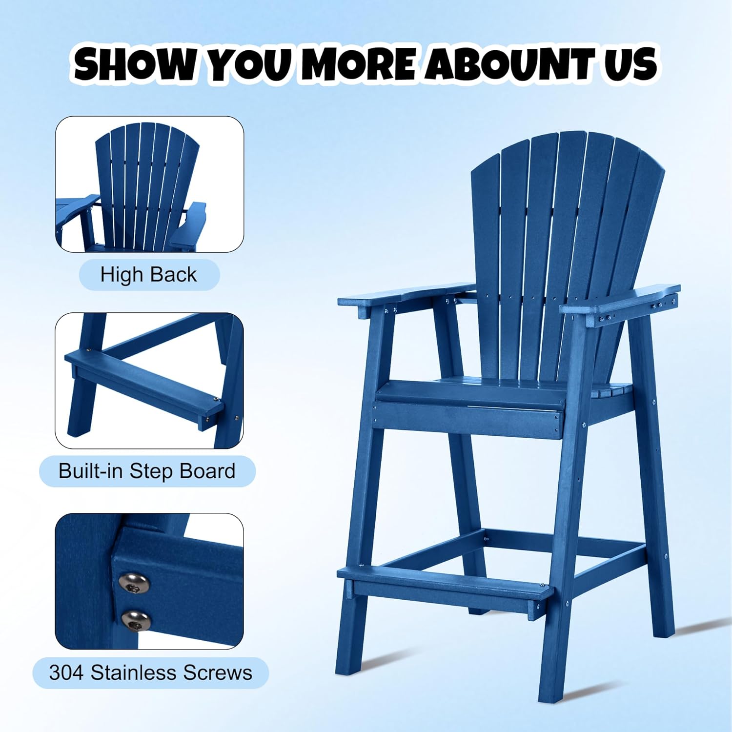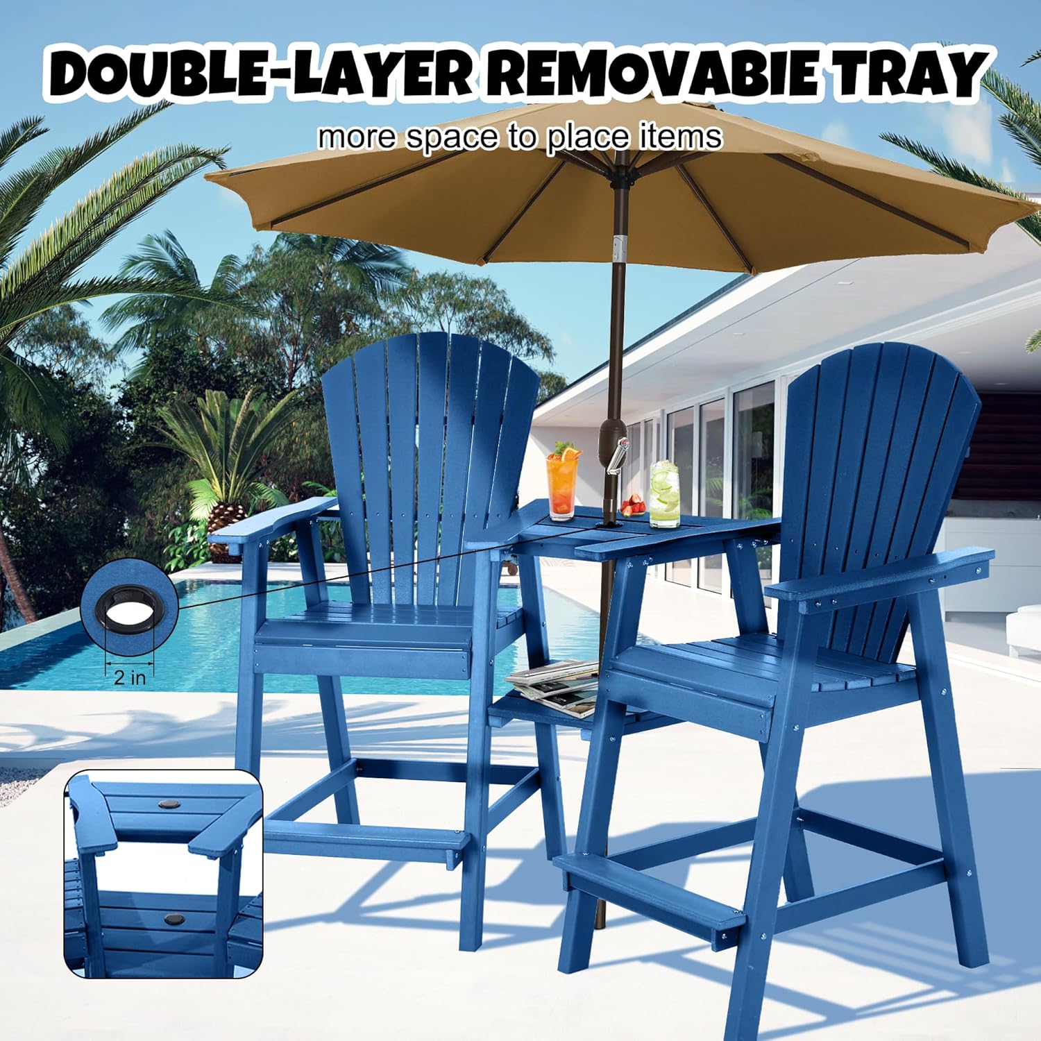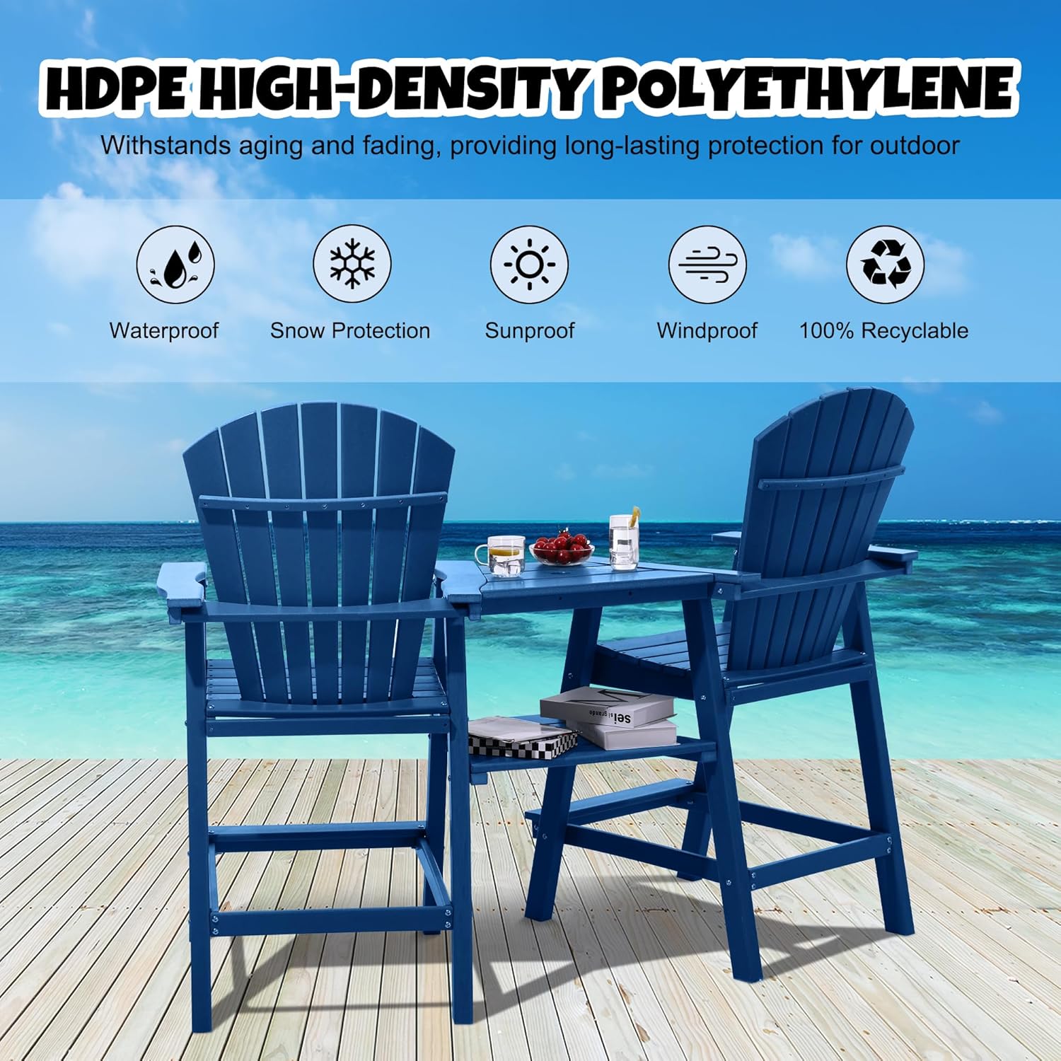 Tall Adirondack Chair Set of 2,HDPE Balcony Chair with Double Connecting Tray,Adirondack Bar Stools Weather Resistant Poly Deck Chairs for Patio Backyard Poolside 360LBS Capacity Blue