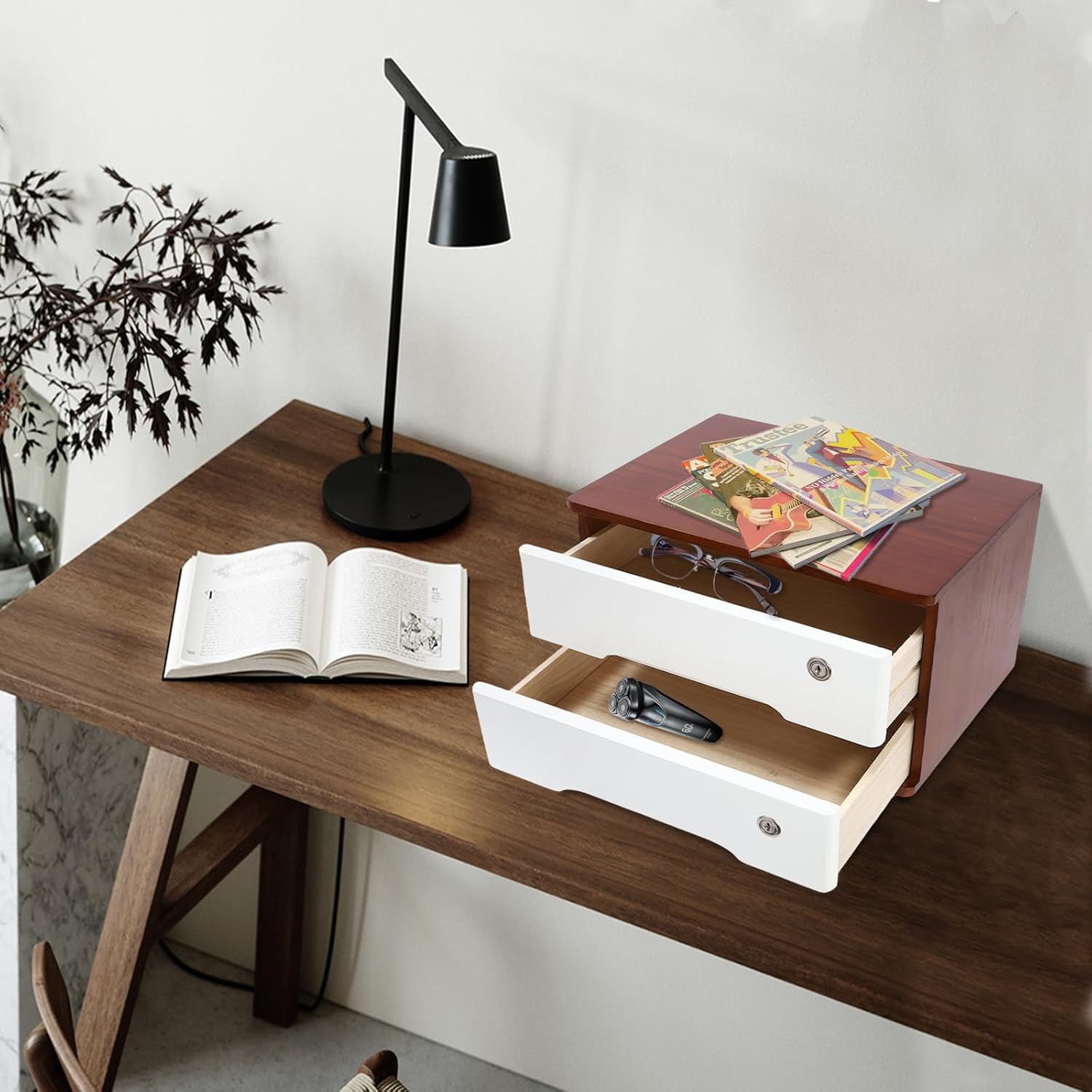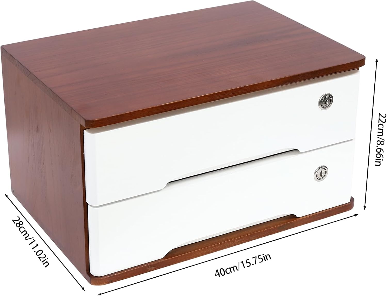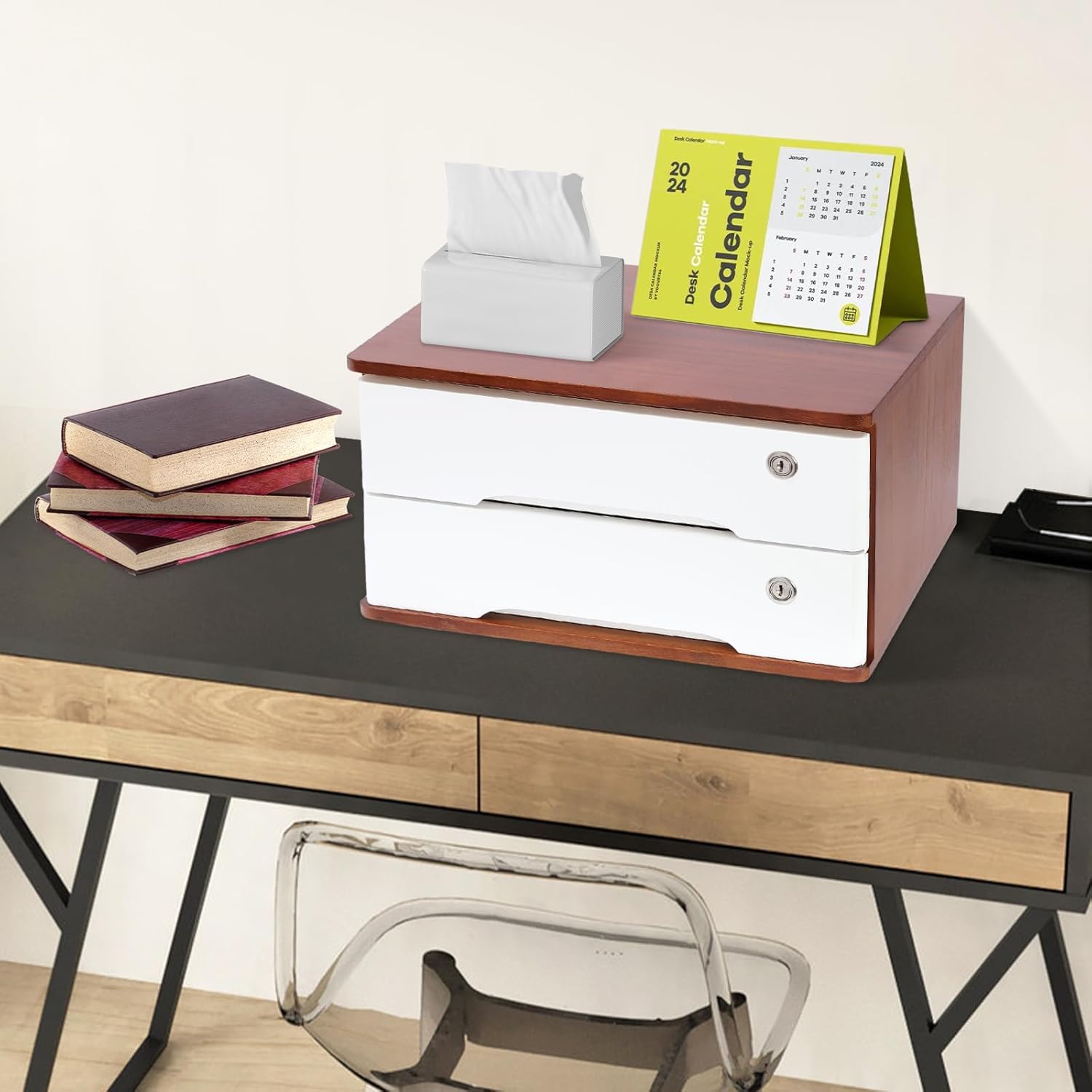 2-Tiers Wooden Desktop Storage Box with Lockable Drawers, Office Supplies File Organizer, Flat File Cabinet Store Stamps, Sticky Notes, Paper Clips, Scissors, for Office, Walnut&White Color