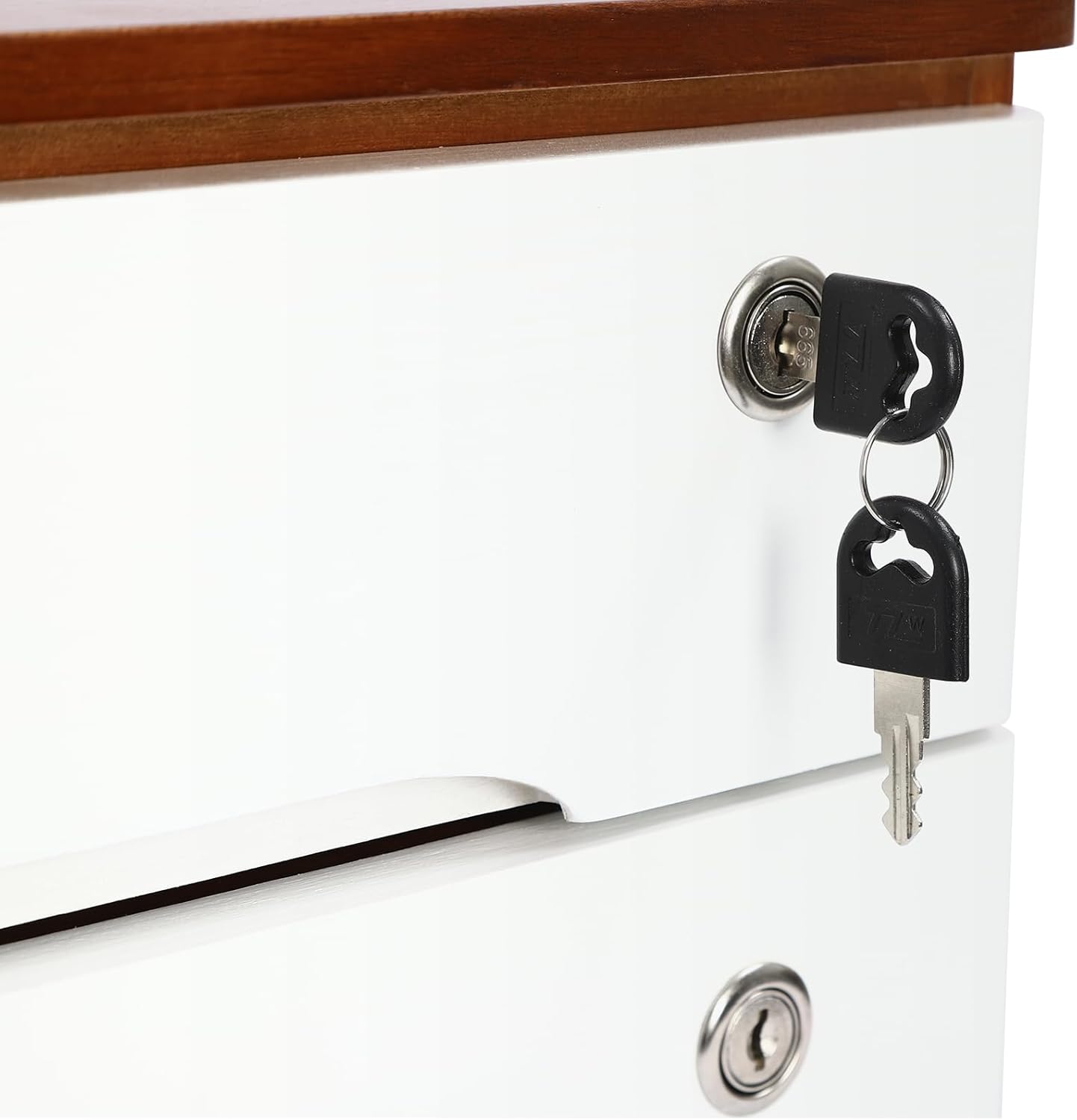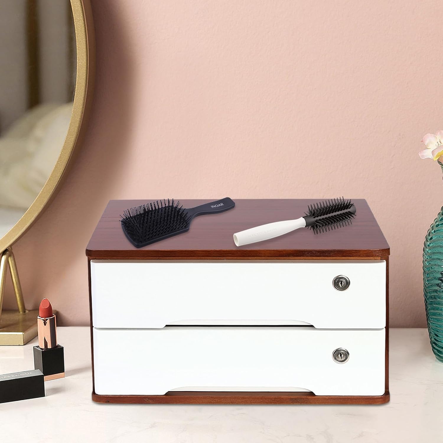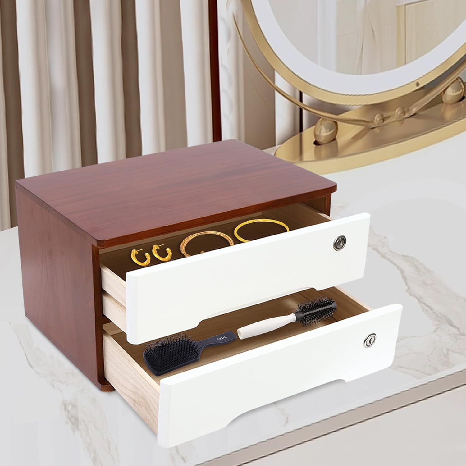 2-Tiers Wooden Desktop Storage Box with Lockable Drawers, Office Supplies File Organizer, Flat File Cabinet Store Stamps, Sticky Notes, Paper Clips, Scissors, for Office, Walnut&White Color