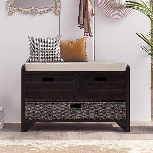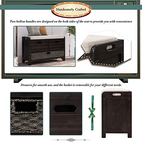 HOUAGI Storage Bench with Removable Basket and 2 Drawers,32”Entryway Bench with Shoe Storage and Removable Cushion for Entryway,Mudroom,Under Window,Living Room,Hallway,White