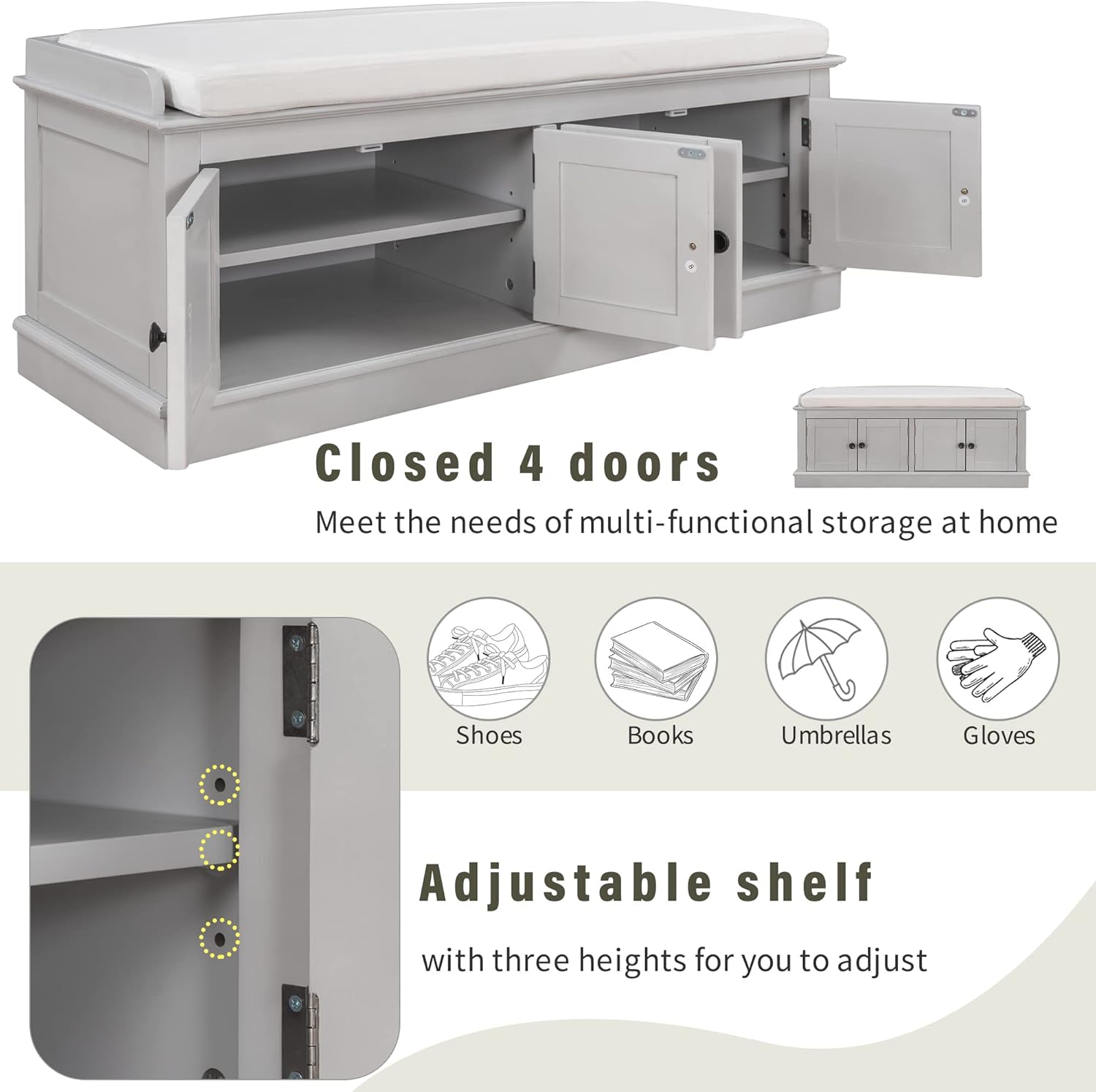 HOUAGI Storage Bench with 4 Doors and Adjustable Shelves,42.7”Entryway Bench with Shoe Storage and Removable Cushion for Entryway,Mudroom,Under Window,Living Room,Hallway,(Gray Wash)