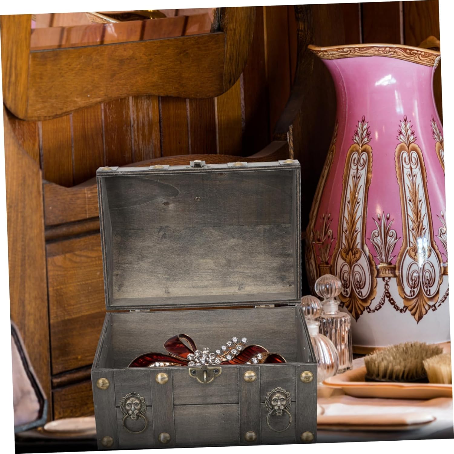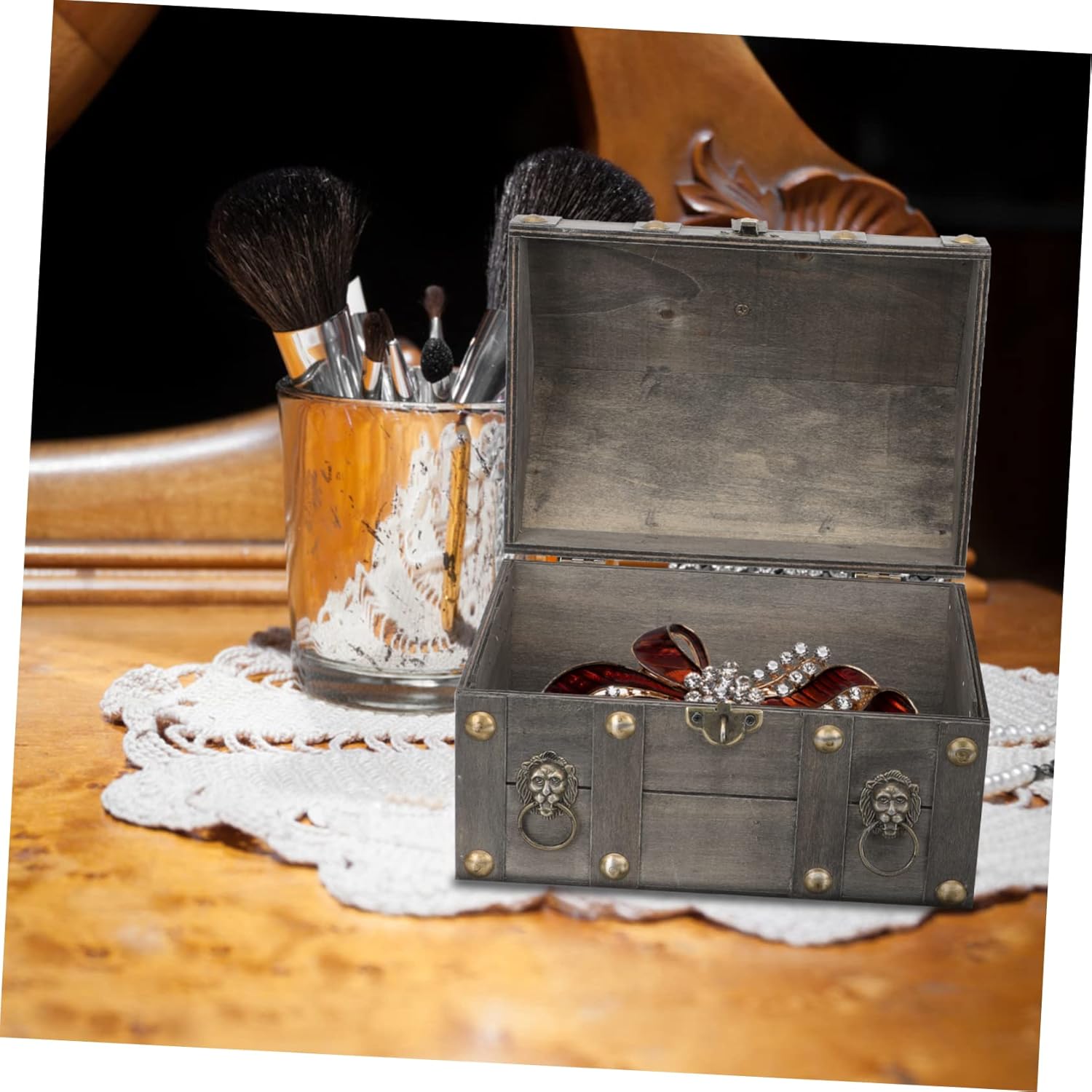 Abaodam 4 Pcs Vintage Treasure Chest Jewelry Organizer for Necklaces Jewelry Necklace Organizer Trunk Wood Pirate Suitcase Organizer Storage Case Child Household Decorative Wood Wooden