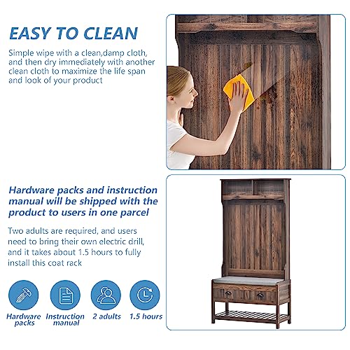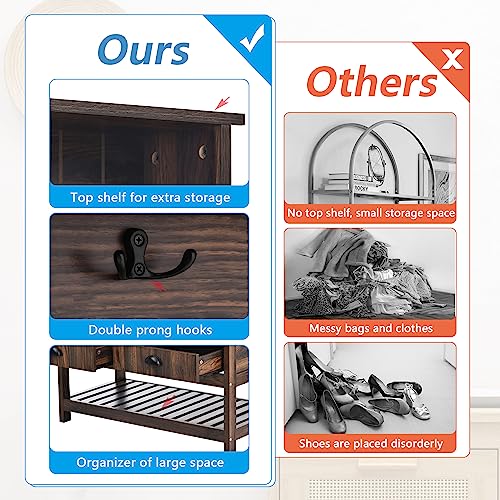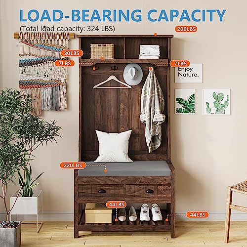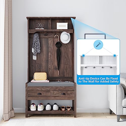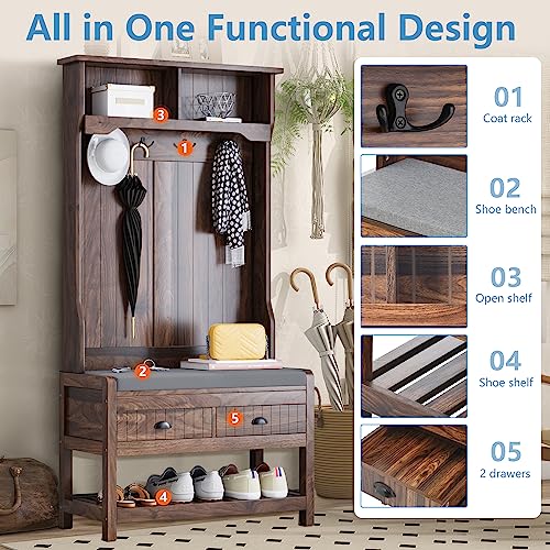 68.9 Inch Hall Tree, 3 in 1 Freestanding Entryway Coat Rack Shoe Bench, Modern Mudroom Bench with Storage and 4 Hooks, 2 Drawers Soft Cushion for for Living Room Bedroom, Brown