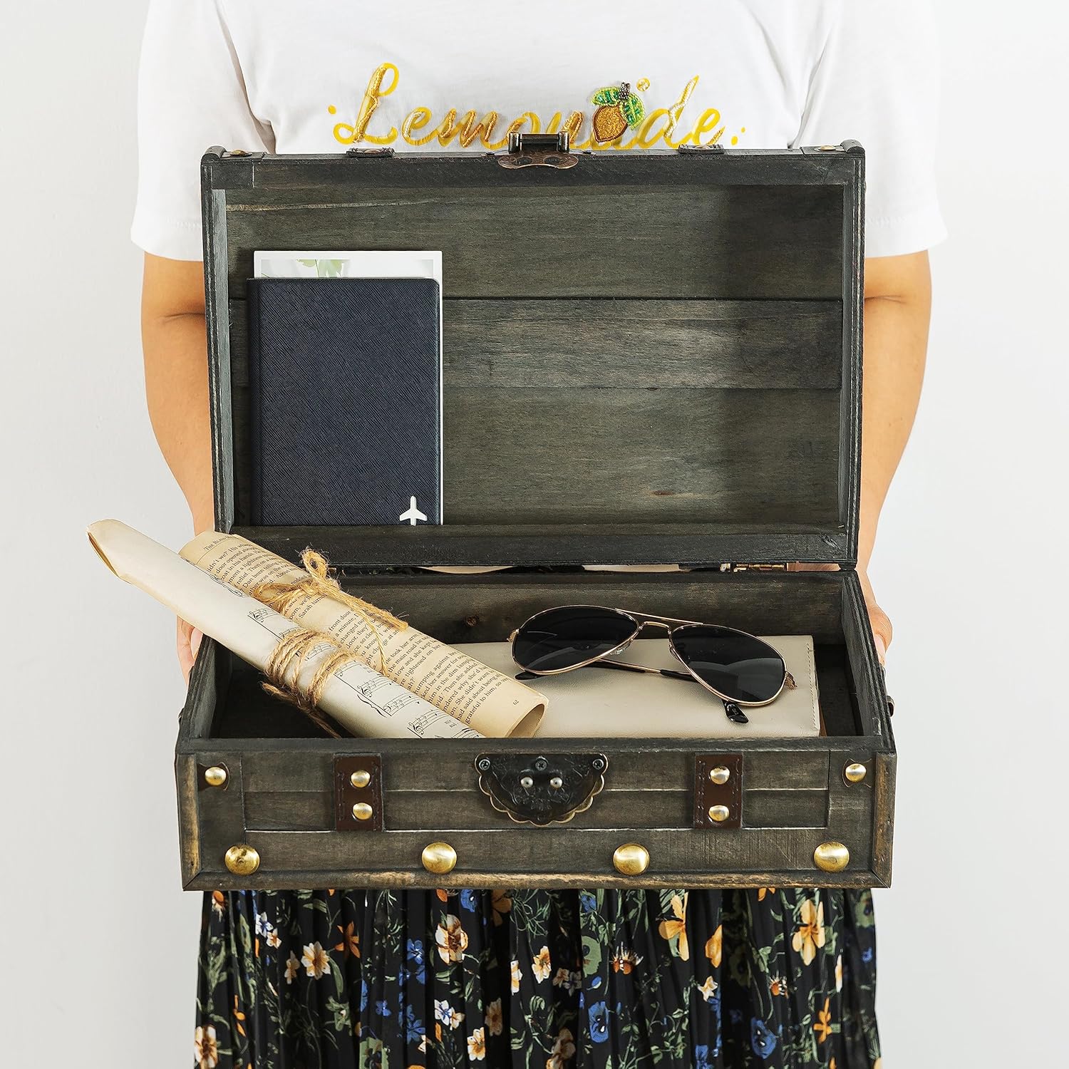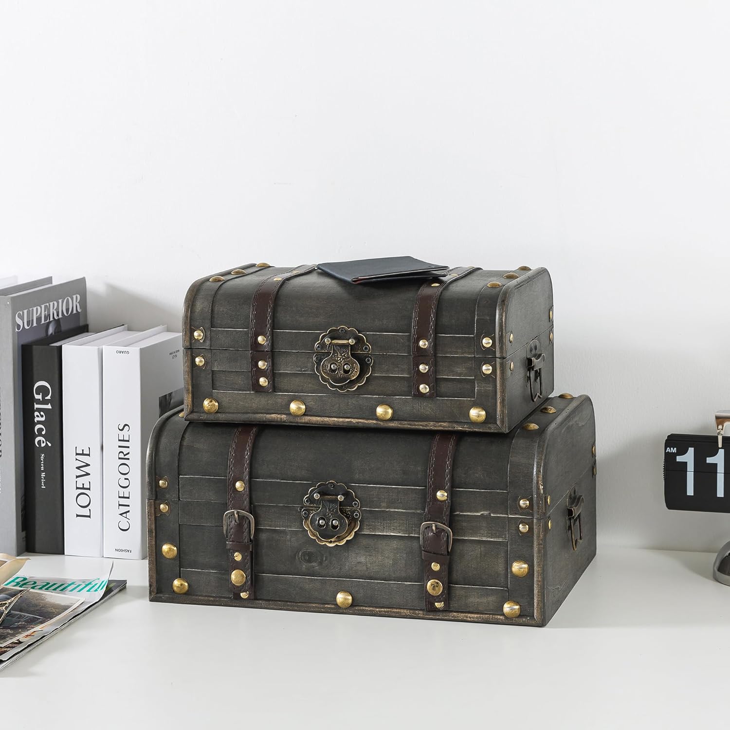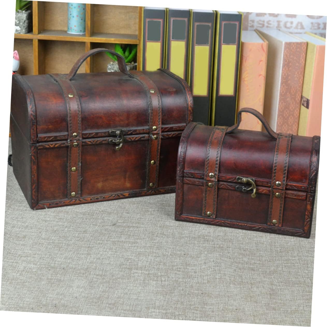 Soul & Lane Explorations Wooden Decorative Storage Boxes - Set of 2, Wood Pirate Chest for Keepsakes and Home Décor, Vintage Suitcase Trunks with Hinged Lids