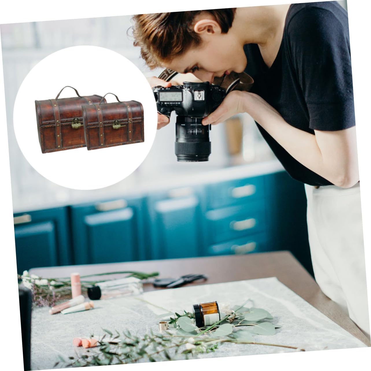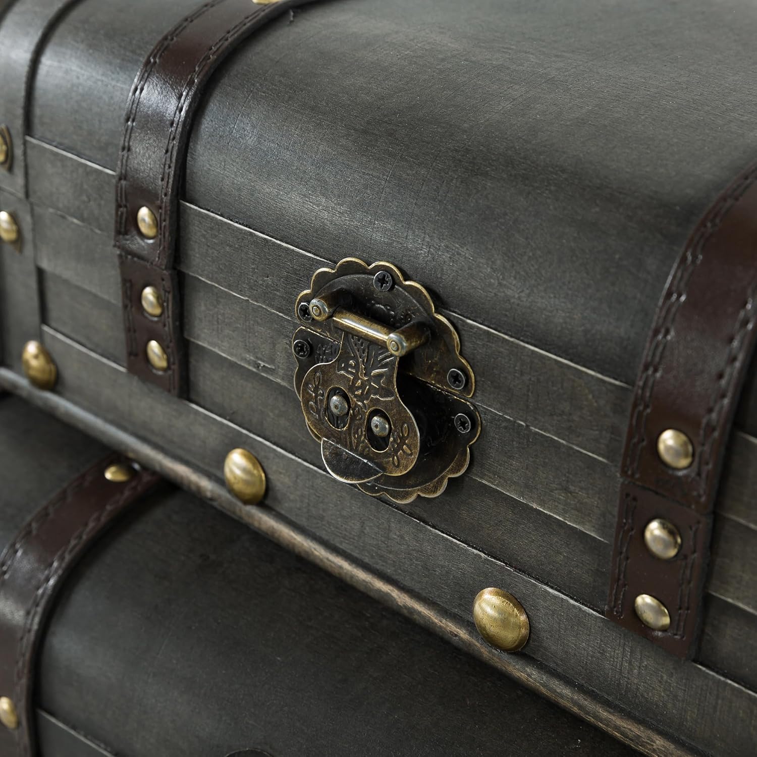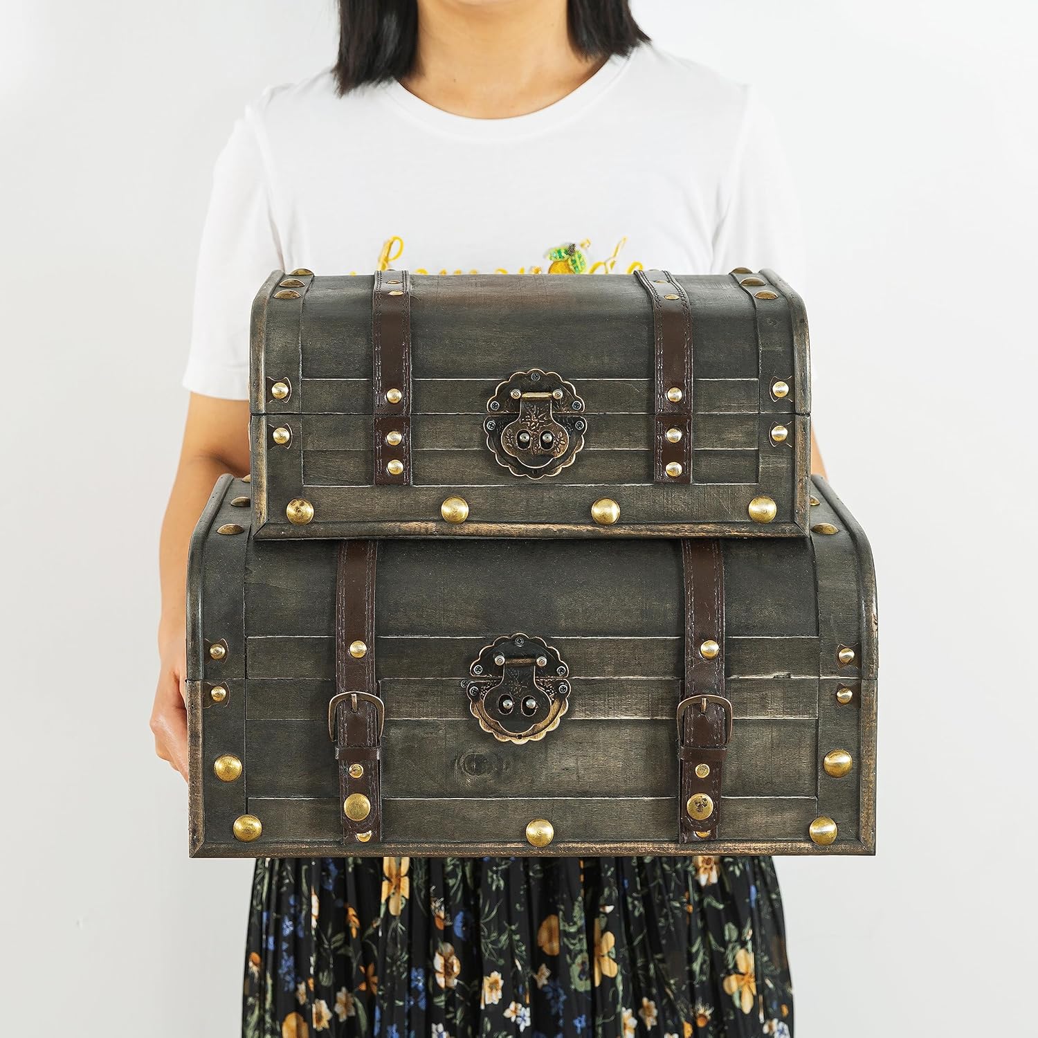 Soul & Lane Explorations Wooden Decorative Storage Boxes - Set of 2, Wood Pirate Chest for Keepsakes and Home Décor, Vintage Suitcase Trunks with Hinged Lids
