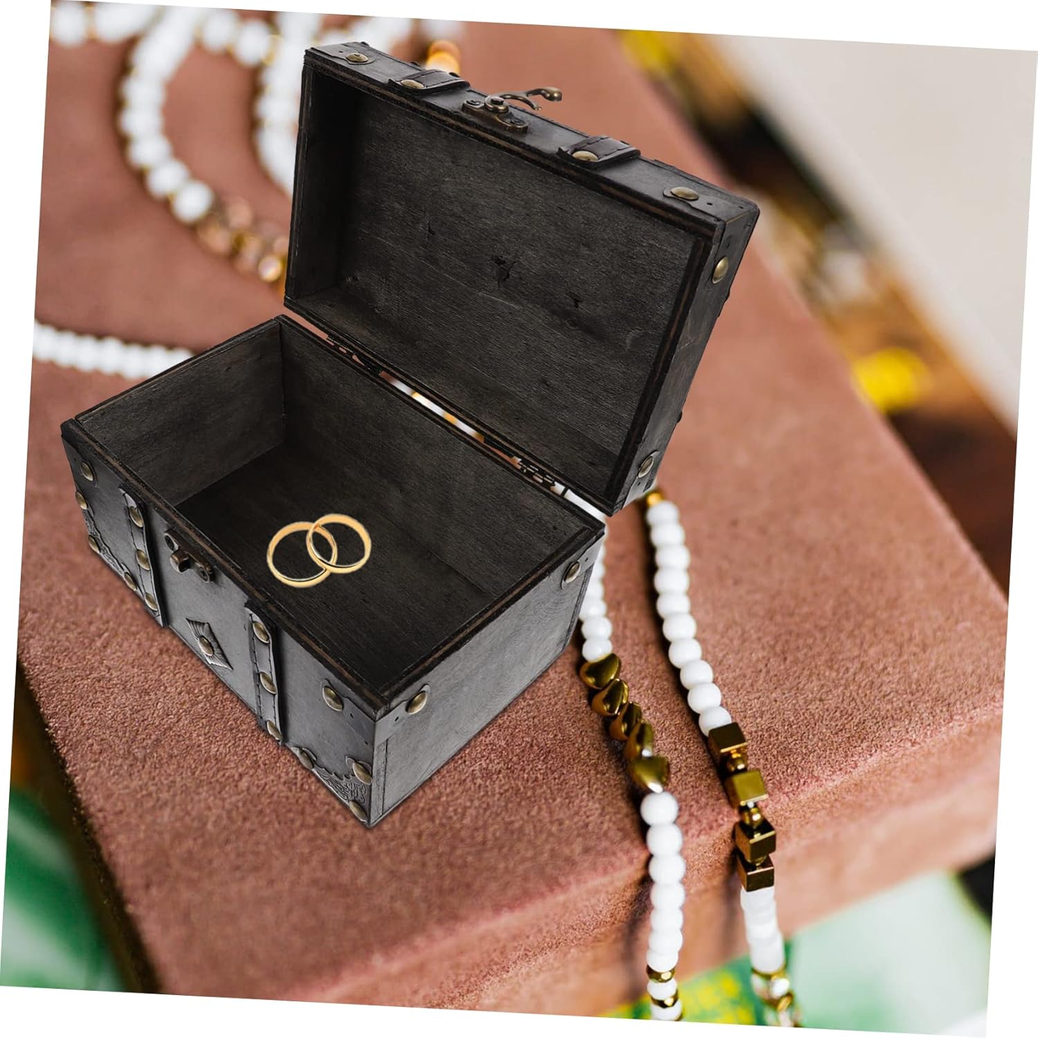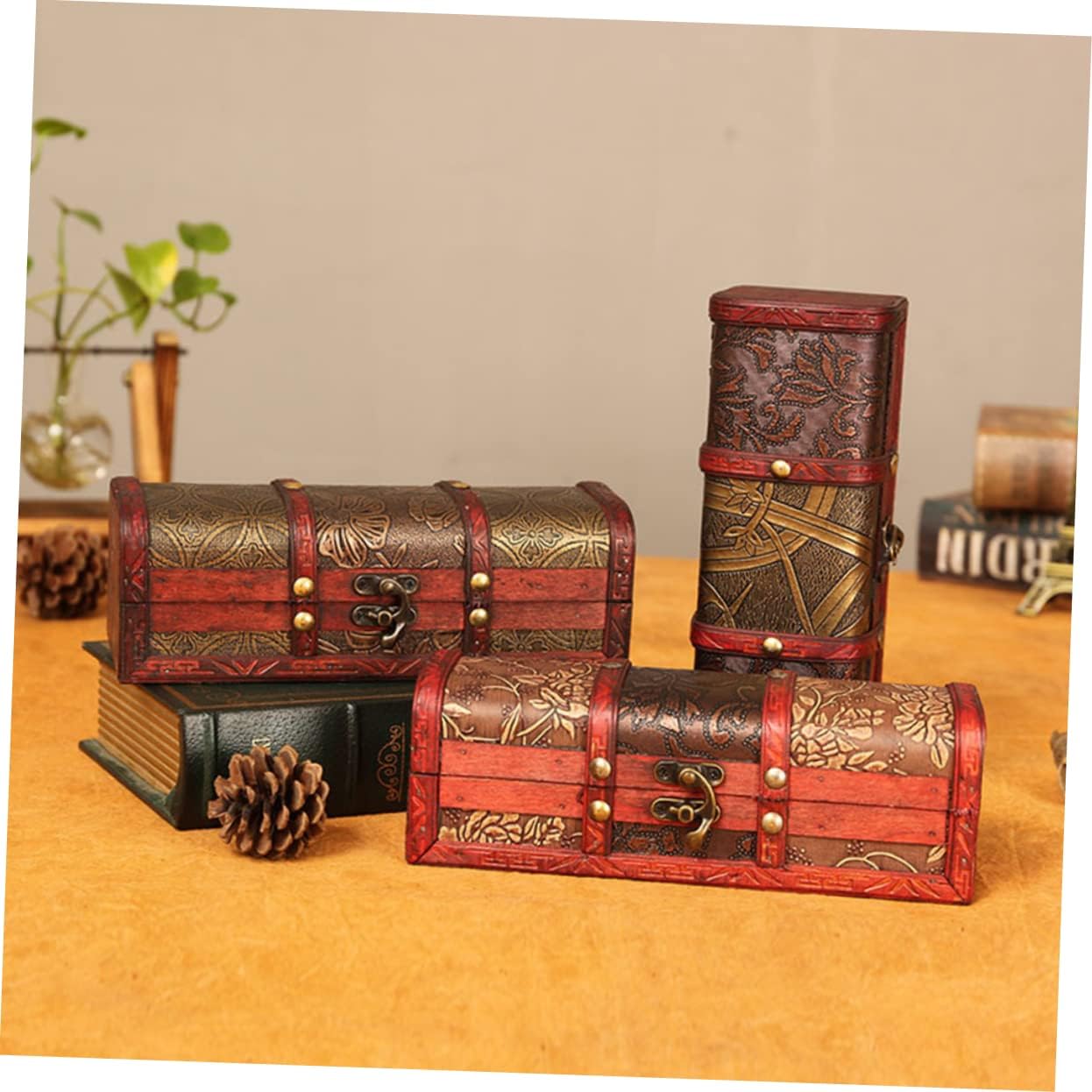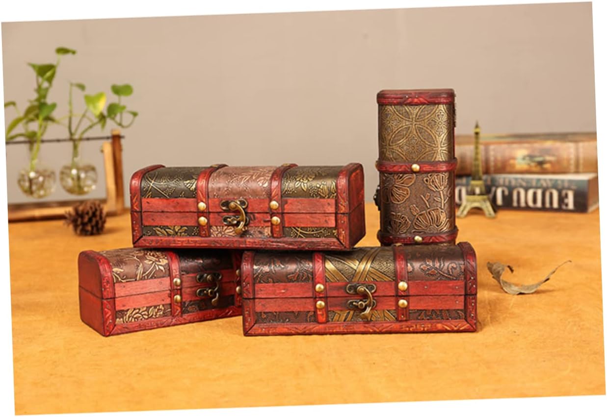 Garneck 4 Pcs vintage treasure chest jewelry organizer for necklaces trunk wood Wooden Treasure Chest with Lock Vintage Wood Chest tablescape decor Photo Prop piggy bank iron baby desktop