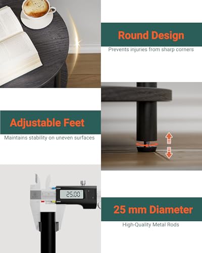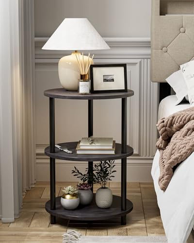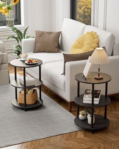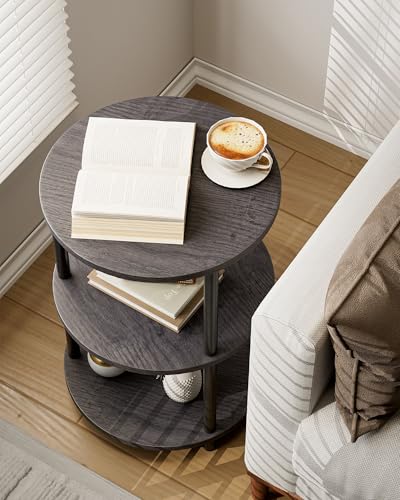 Round Side Table Living Room - Small Accent Table with 3 Tier Shelves, Rustic Wooden Couch End Table for Bedroom or Living Room, Reinforced Metal Legs, Set of 2, Charcoal Gray