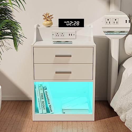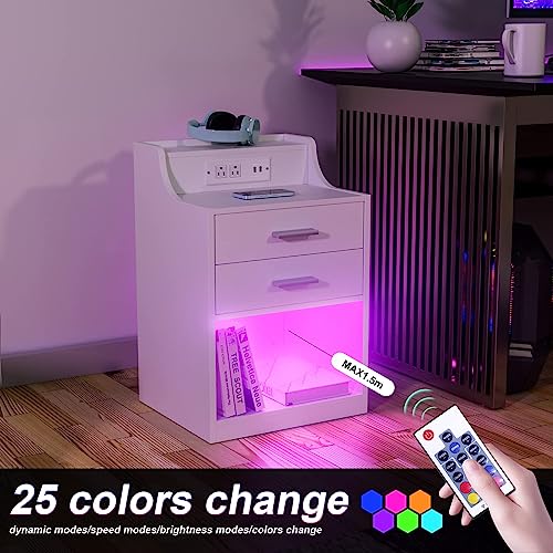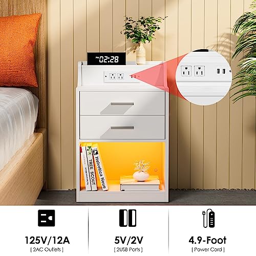 Nightstands Set of 2 with Charging Station and LED Lights, Night Stand with Outlets Modern End Table with 2 Drawers, Bedside Table with USB Open Compartment for Bedroom Living Room (2, White, Improve)