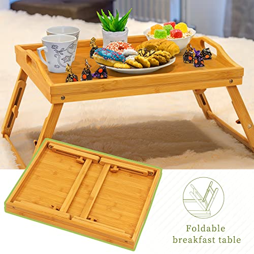 2 Pack Breakfast Bed Tray for Eating - Raised Food Table Up to 9.5" on Lap Sofa - Adjustable Bamboo Serving Tray - Portable Snack Platter with Folding Legs Ideal for Bedroom Picnic