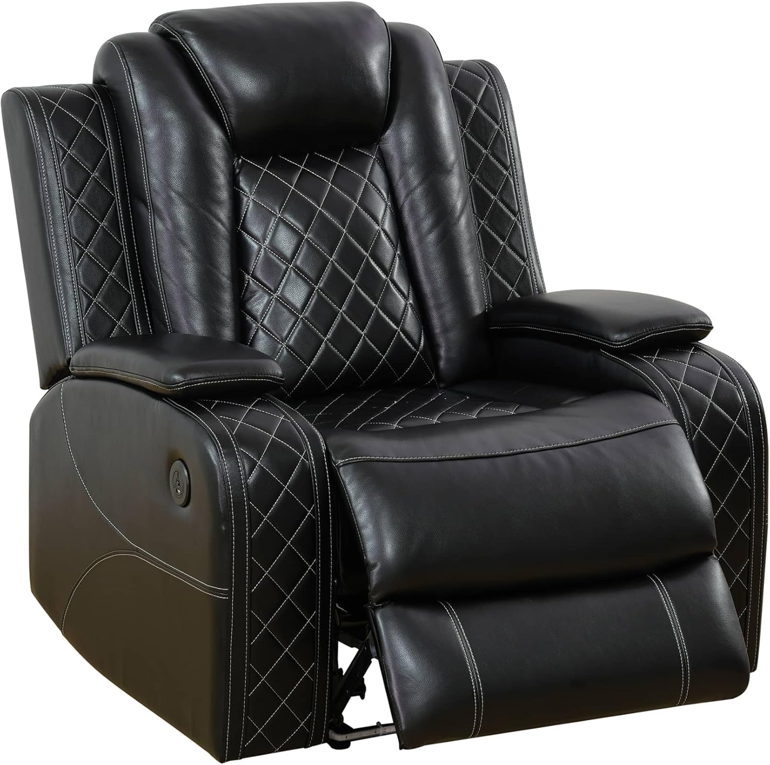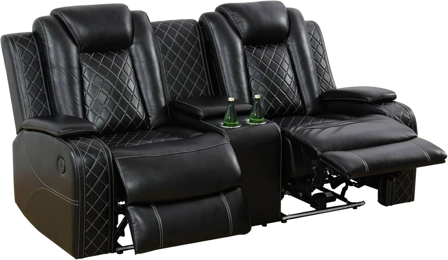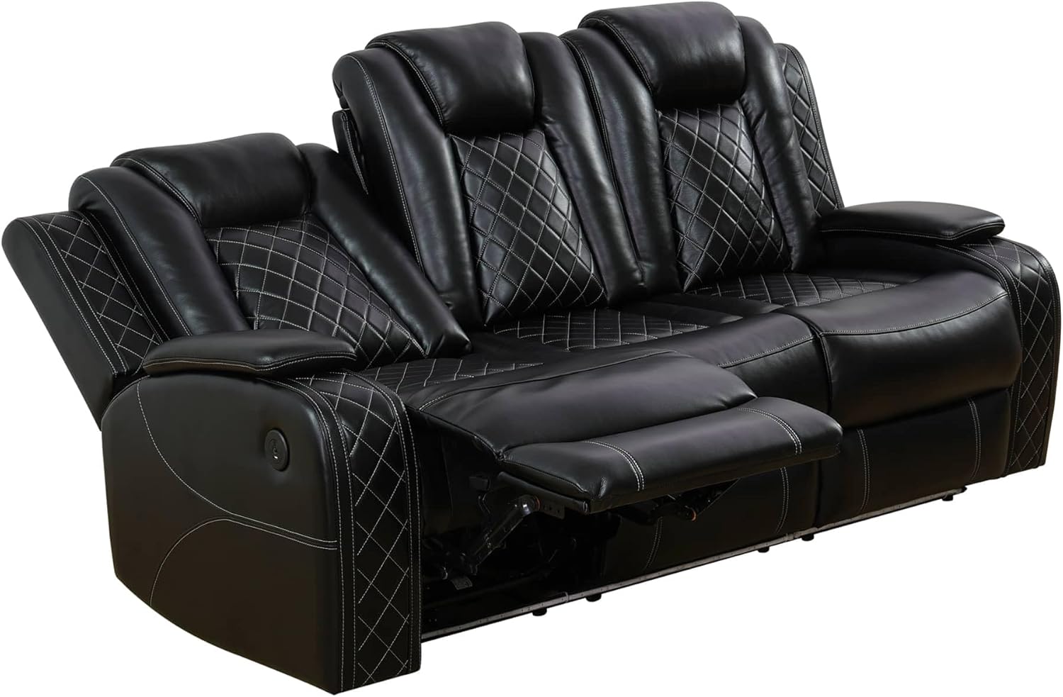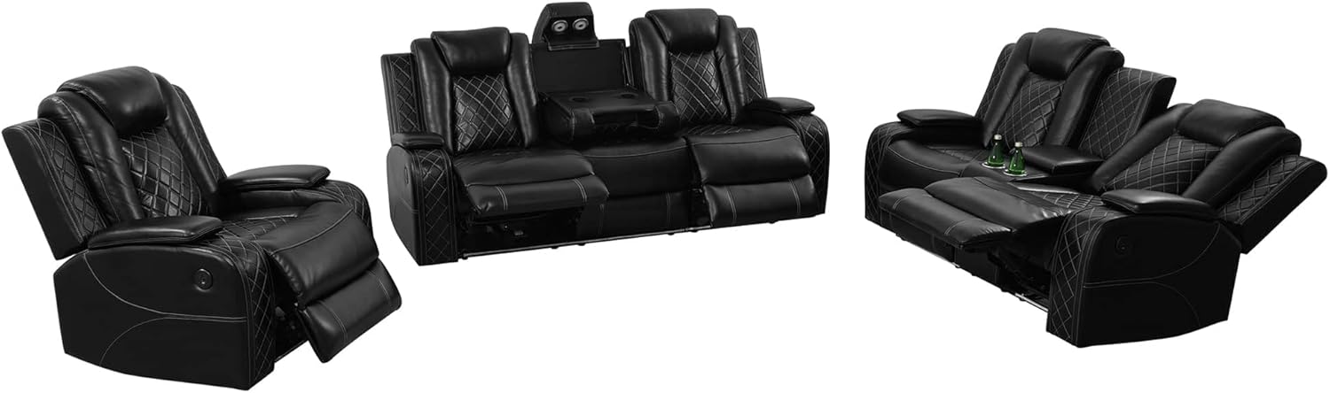 3 Pieces Multifunction Power Air Leather Sofa Set with LED Lights, Couch, Loveseat Chair with USB Port/Storage Console/Cup Holders, Home Theater Seating Reclining Sofá, Black