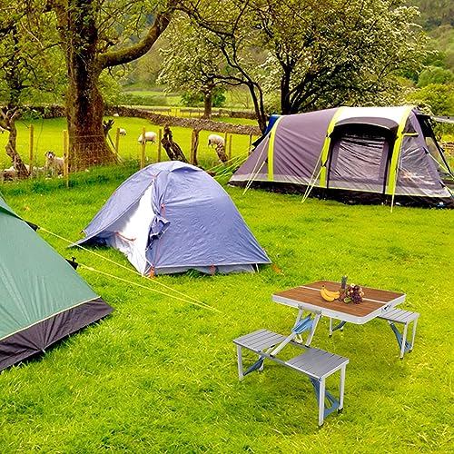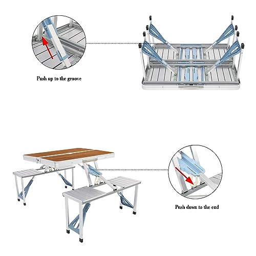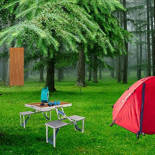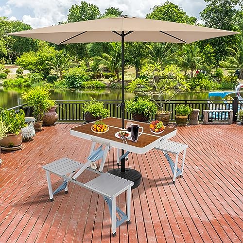 Folding Picnic Table with Umbrella Hole,Aluminum Suitcase Portable Outdoor Table with 4 Seats,for Patio,Porch or Camping Table and Chair Set (Wood Grain Color)