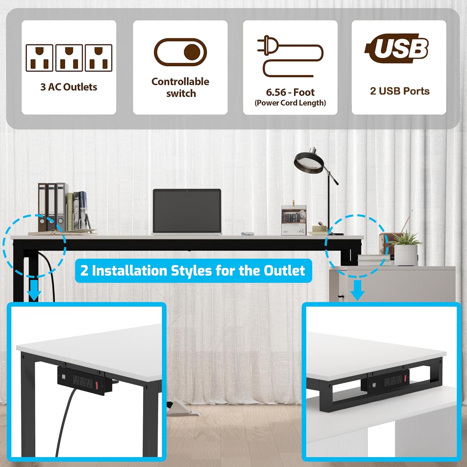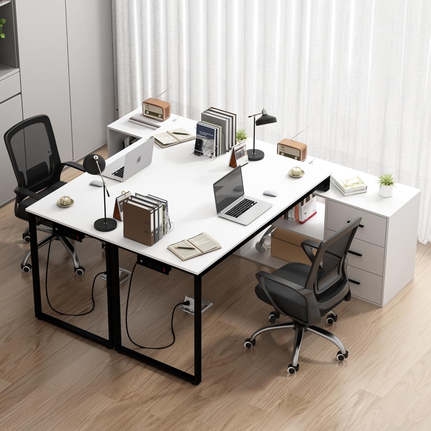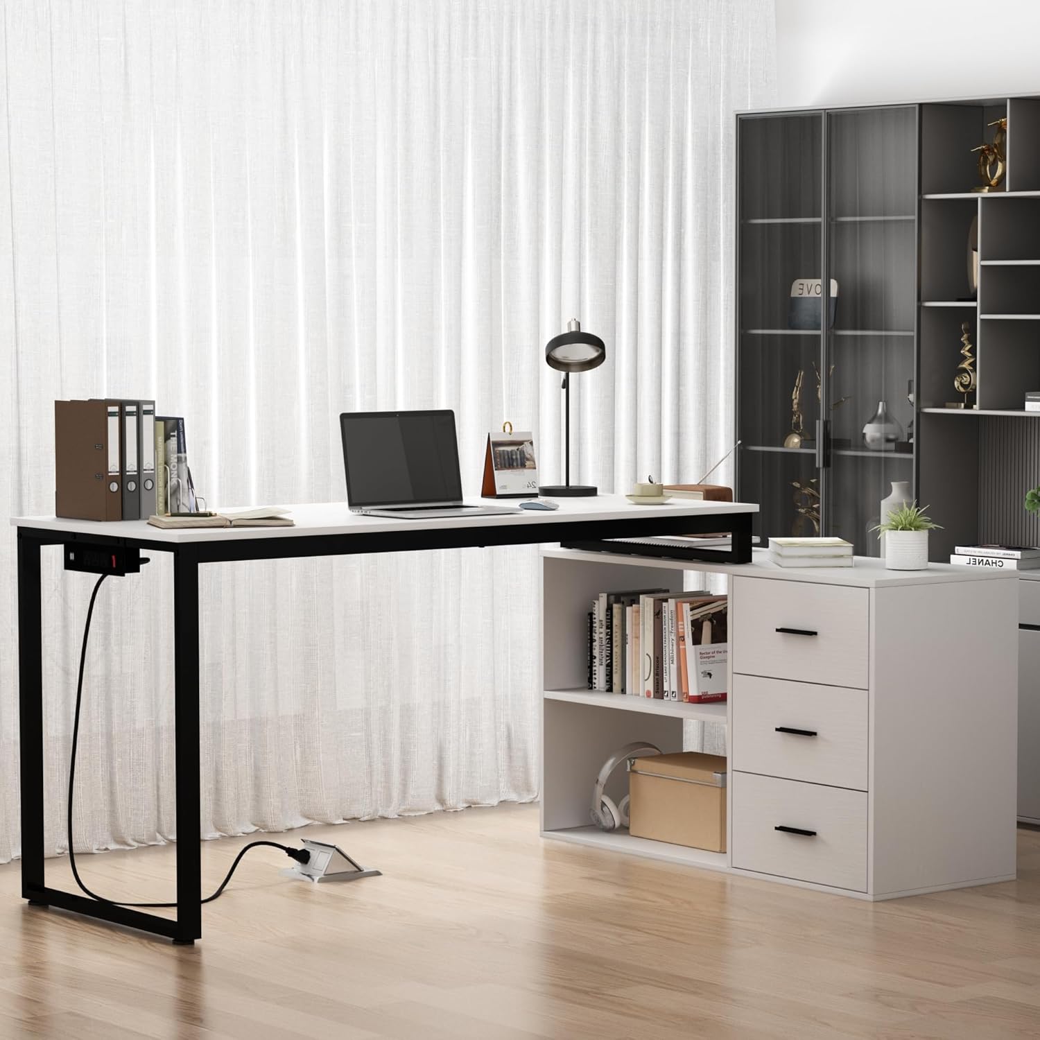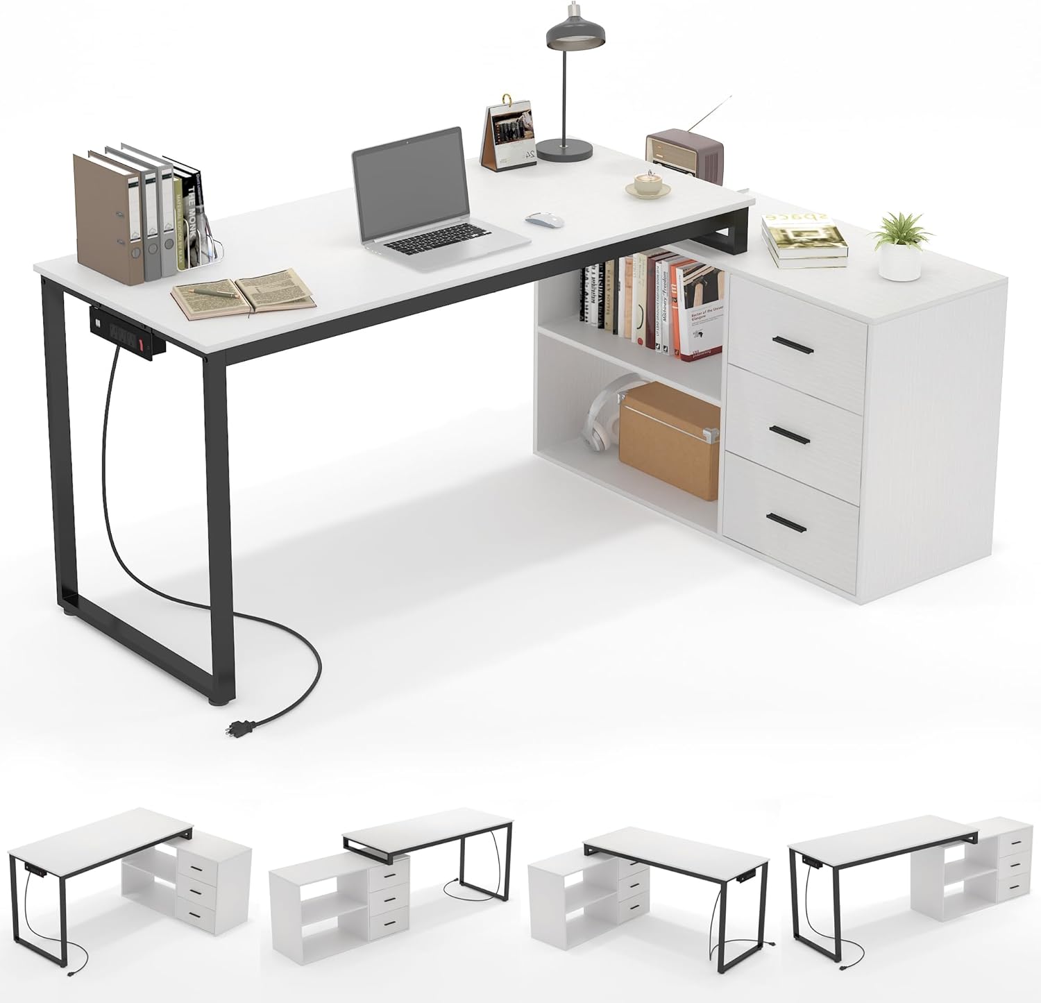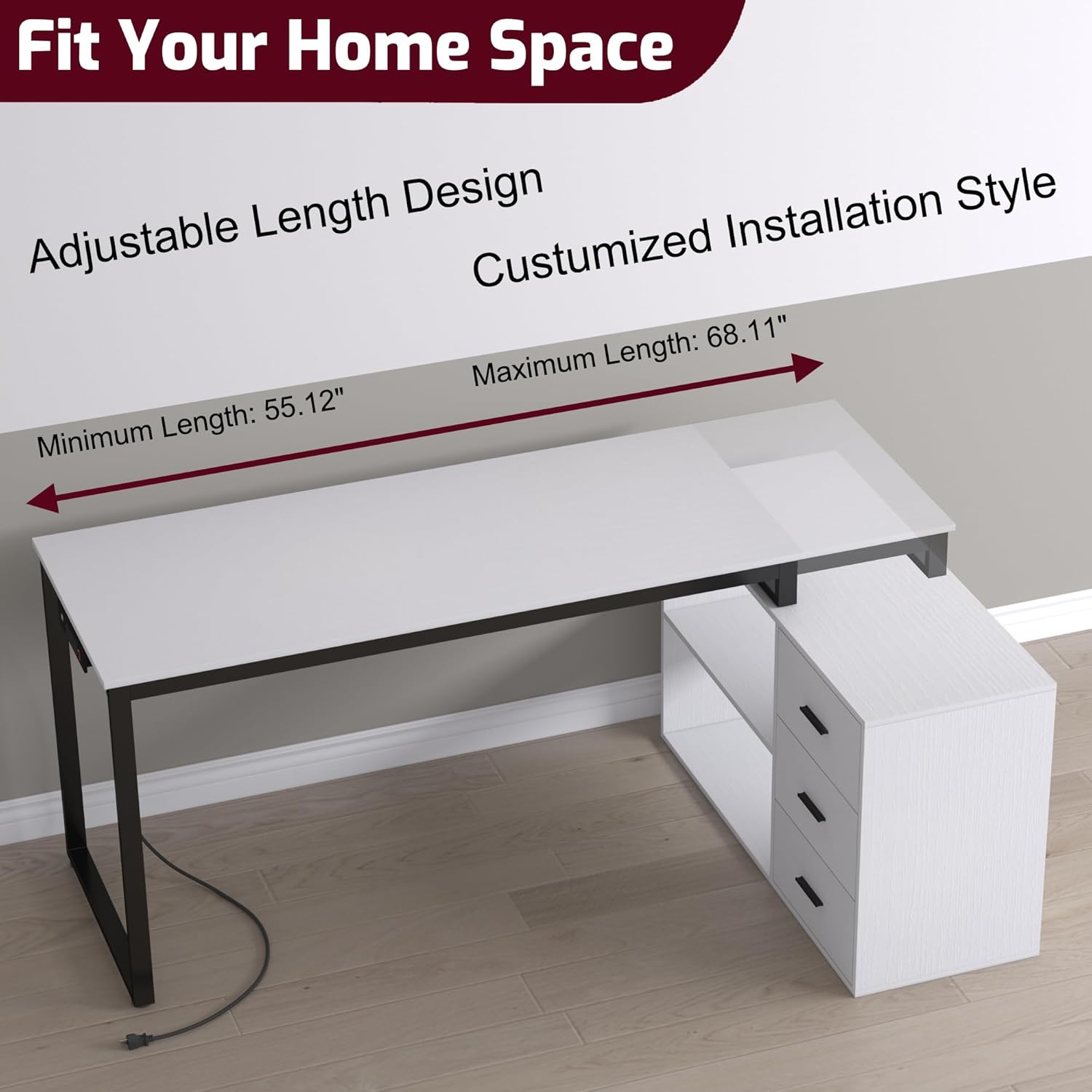 Computer Desk with Drawers and Shelves,55 Inch Large L Shaped Office Desk with Storage,Writing Study Desk with Power Outlets,Corner White Gaming Desk for Home Office