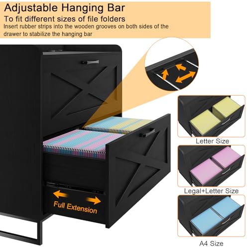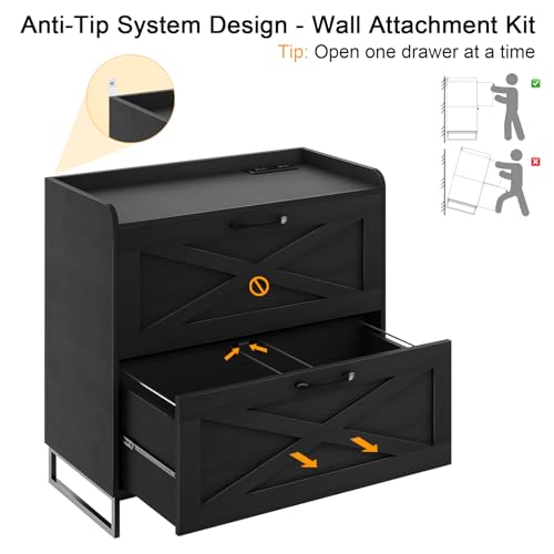 File Cabinet 2 Drawers Lateral File Cabinet with Charging Station for Letter/Legal/A4 Size Hanging Files, Large Wood File Storage Cabinets Printer Stand for Home Office, Brown