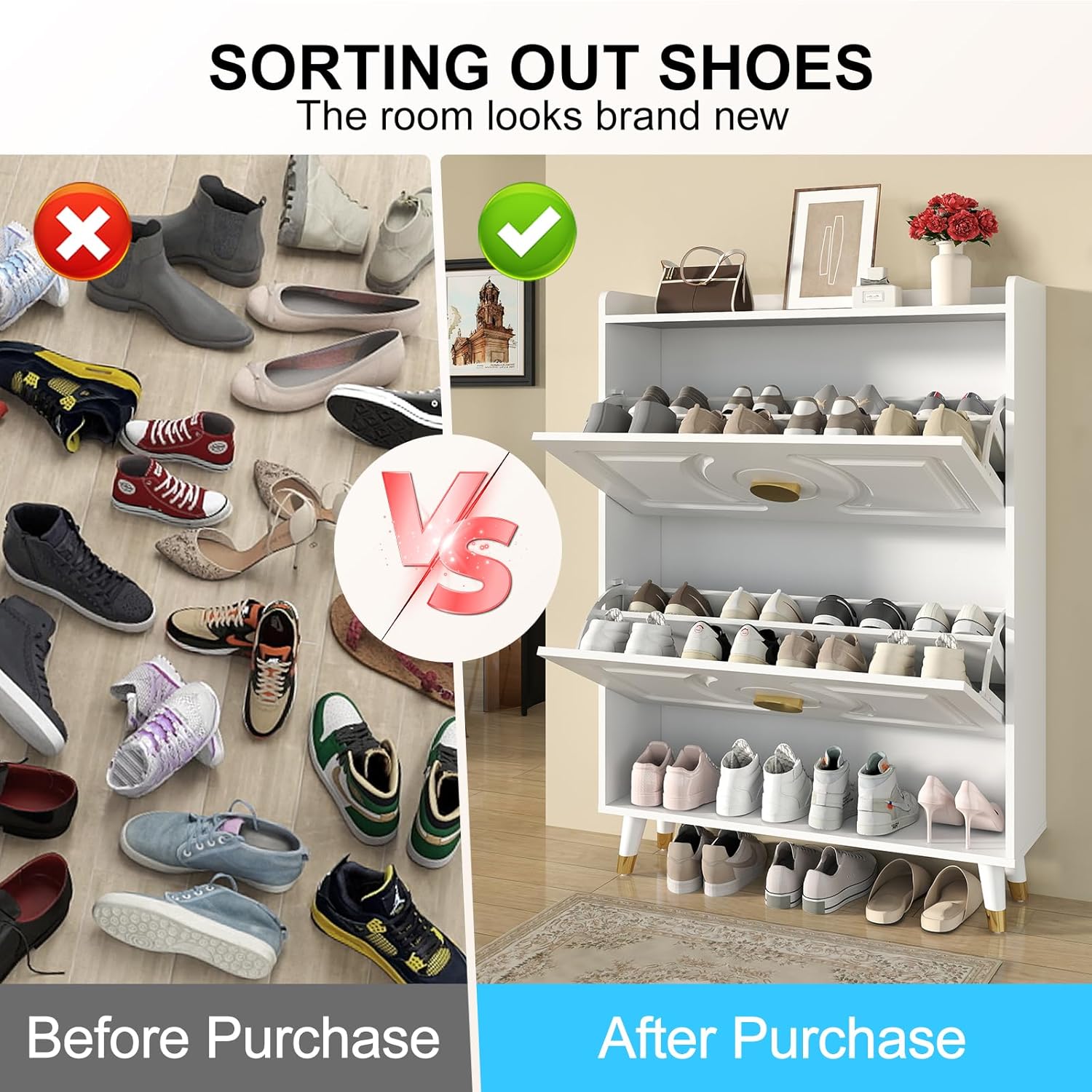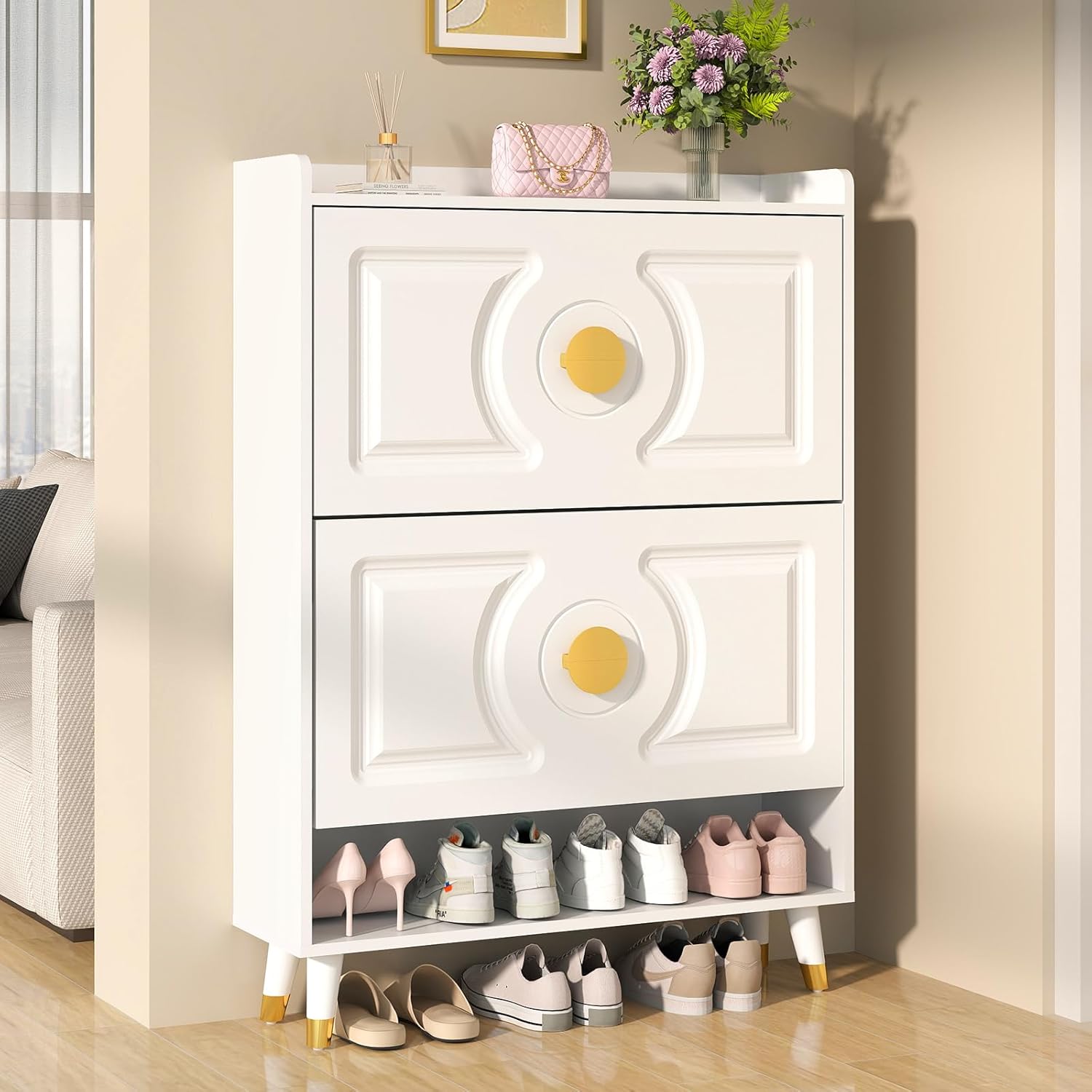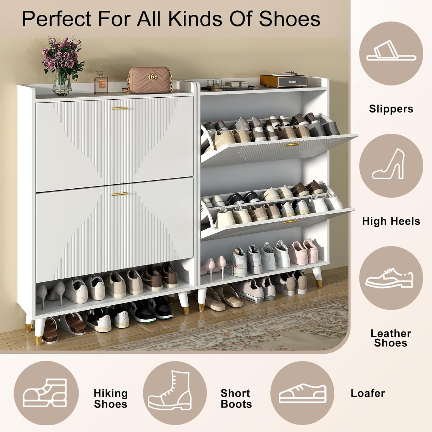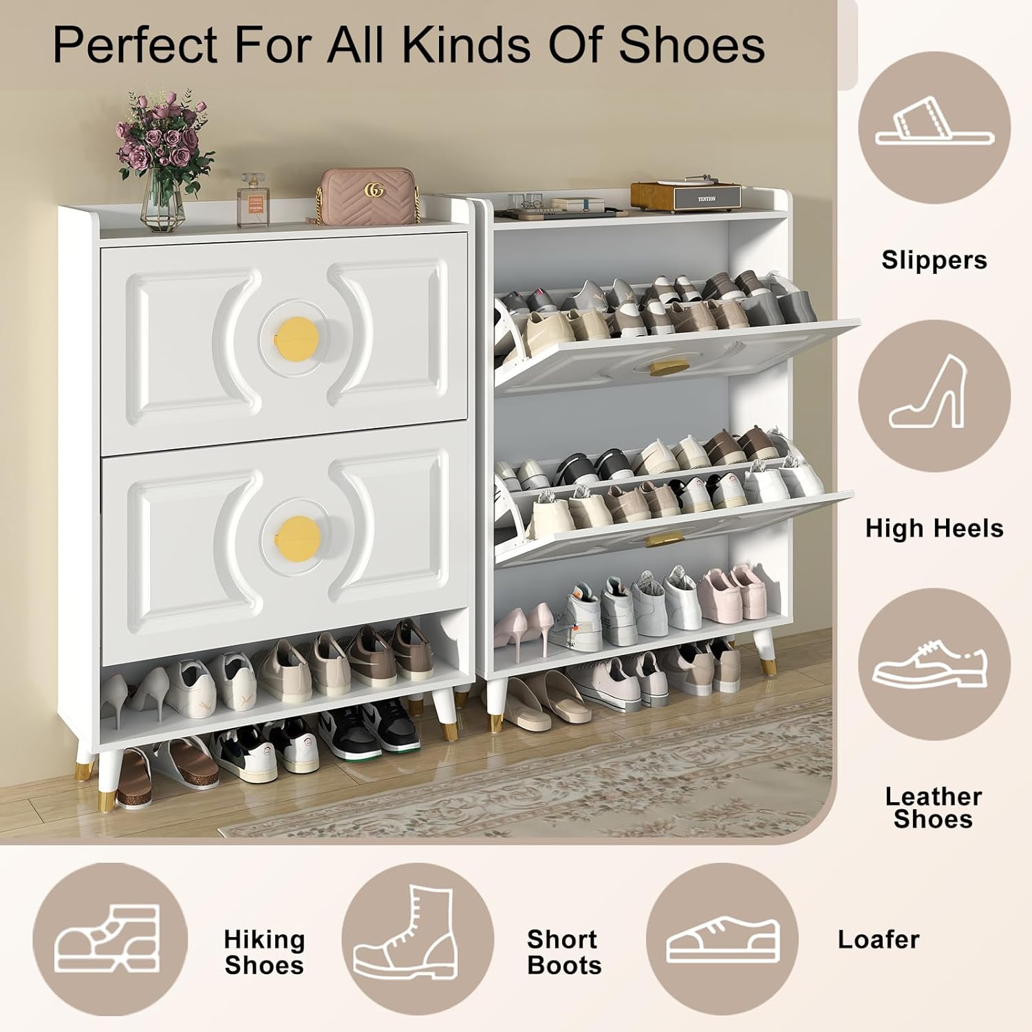 White Shoe Storage Cabinet for Entryway Slim, Hidden Wooden Shoe Organizer Cabinet with Drawer, Ultra Shoe Rack Cabinet for Front Door Entrance