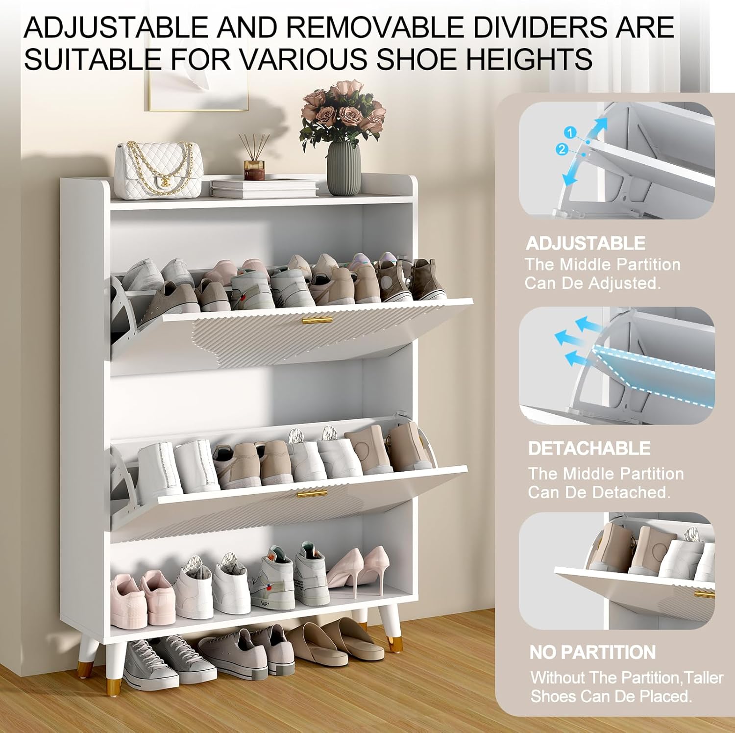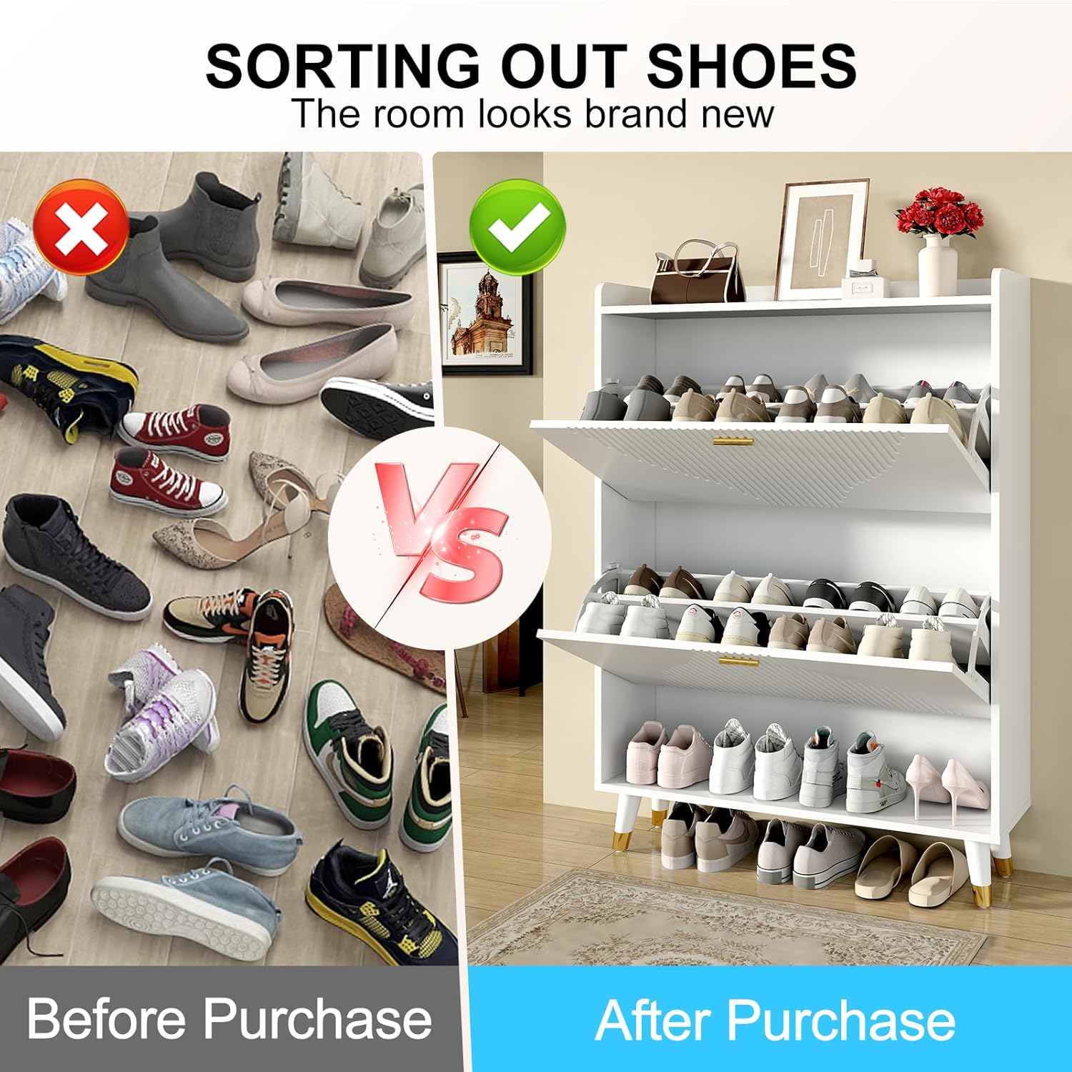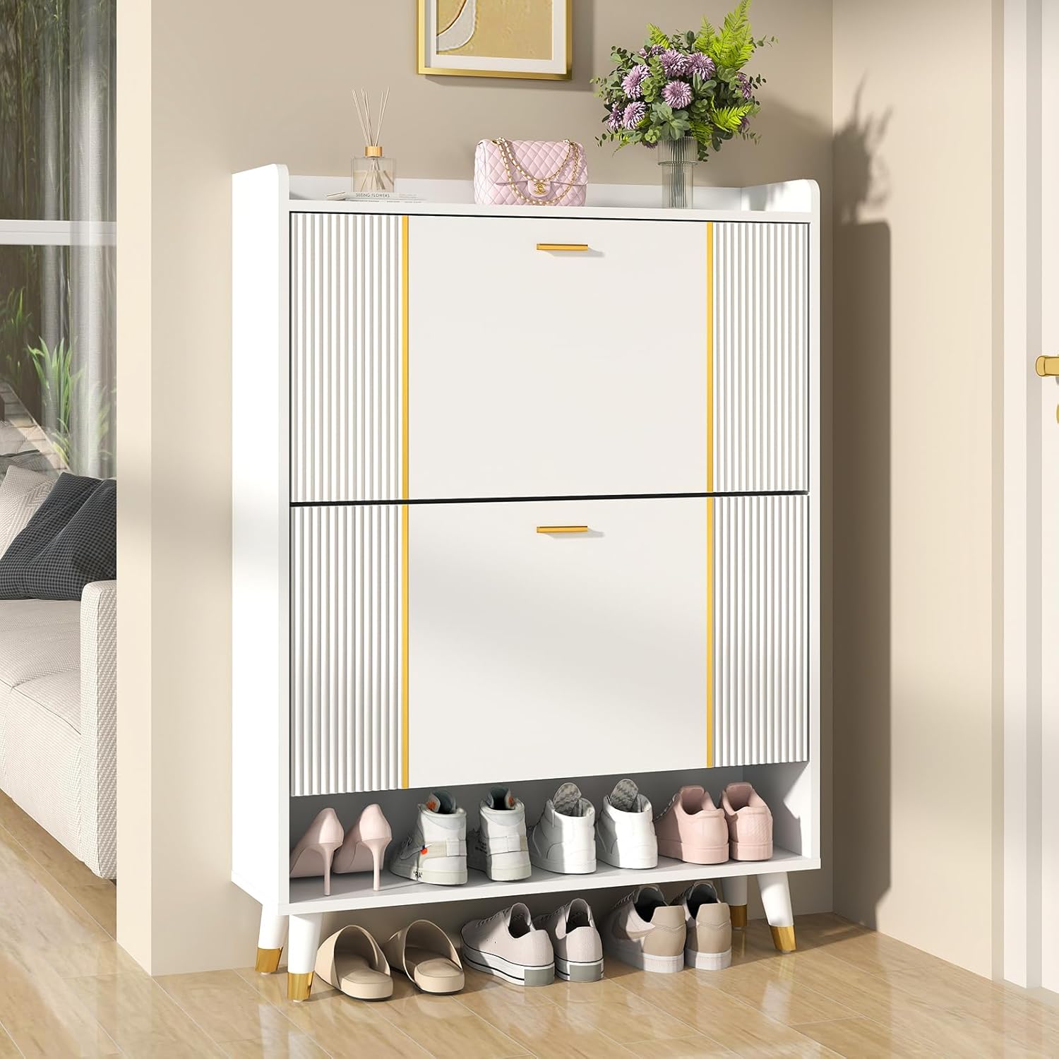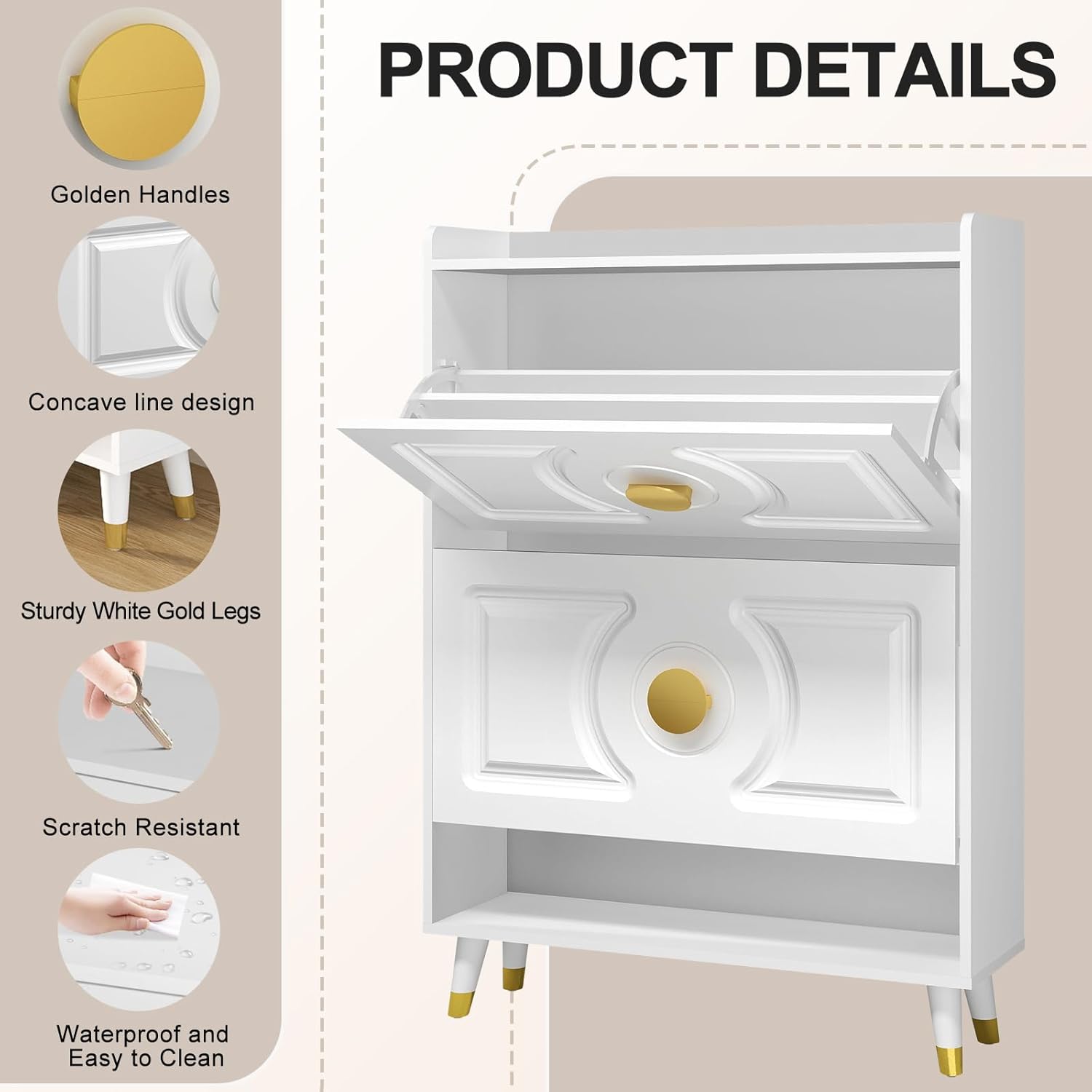 White Shoe Storage Cabinet for Entryway Slim, Hidden Wooden Shoe Organizer Cabinet with Drawer, Ultra Shoe Rack Cabinet for Front Door Entrance