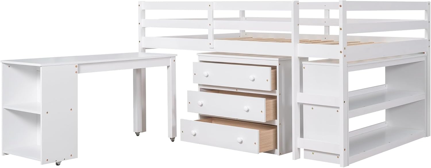 Full Loft Bed in White Solid Wood with Cabinet Shelves and Portable Desk Transitional Nature Natural Finish Hidden Storage