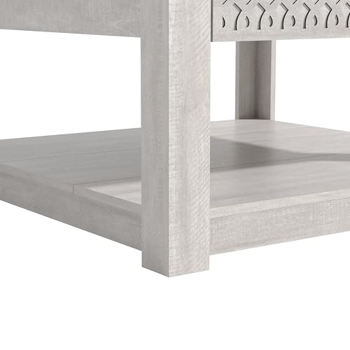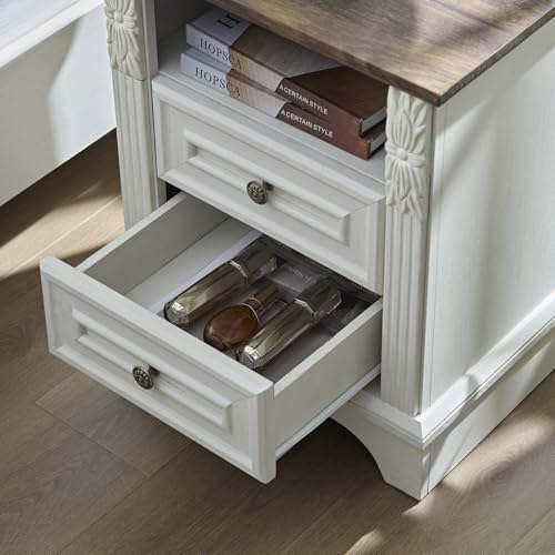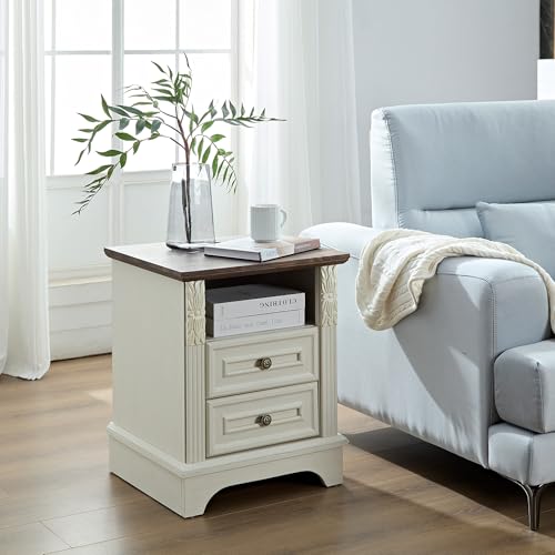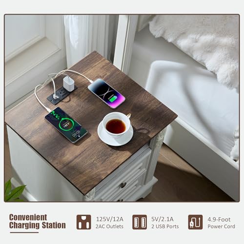 Nightstand wtih Charging Station, 20" End Table with 2 Drawers, Farmhouse Side Table Storage Cabinet with Carved Pilasters for Bedroom, Living Room, Wood Rustic, Dark Rustic Oak