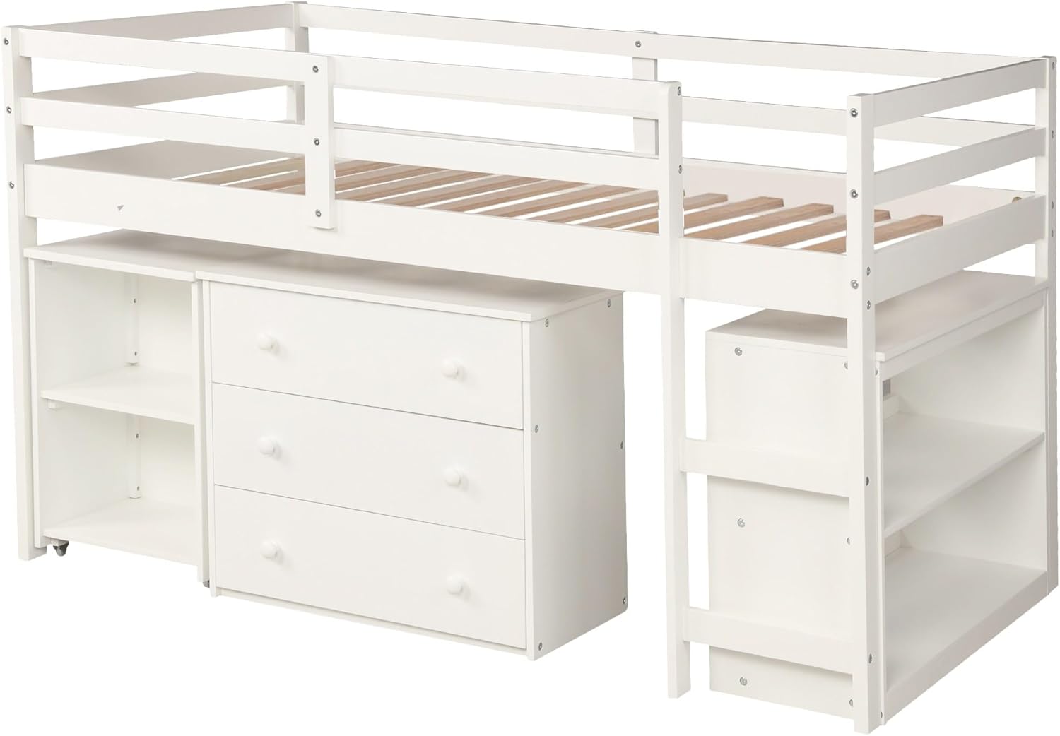 Twin Size Low Loft Bed Wood Study Bedframe with Storage Cabinet Desk White Modern Contemporary Rustic Unisex Nature Space Natural Finish Hidden Includes Hardware