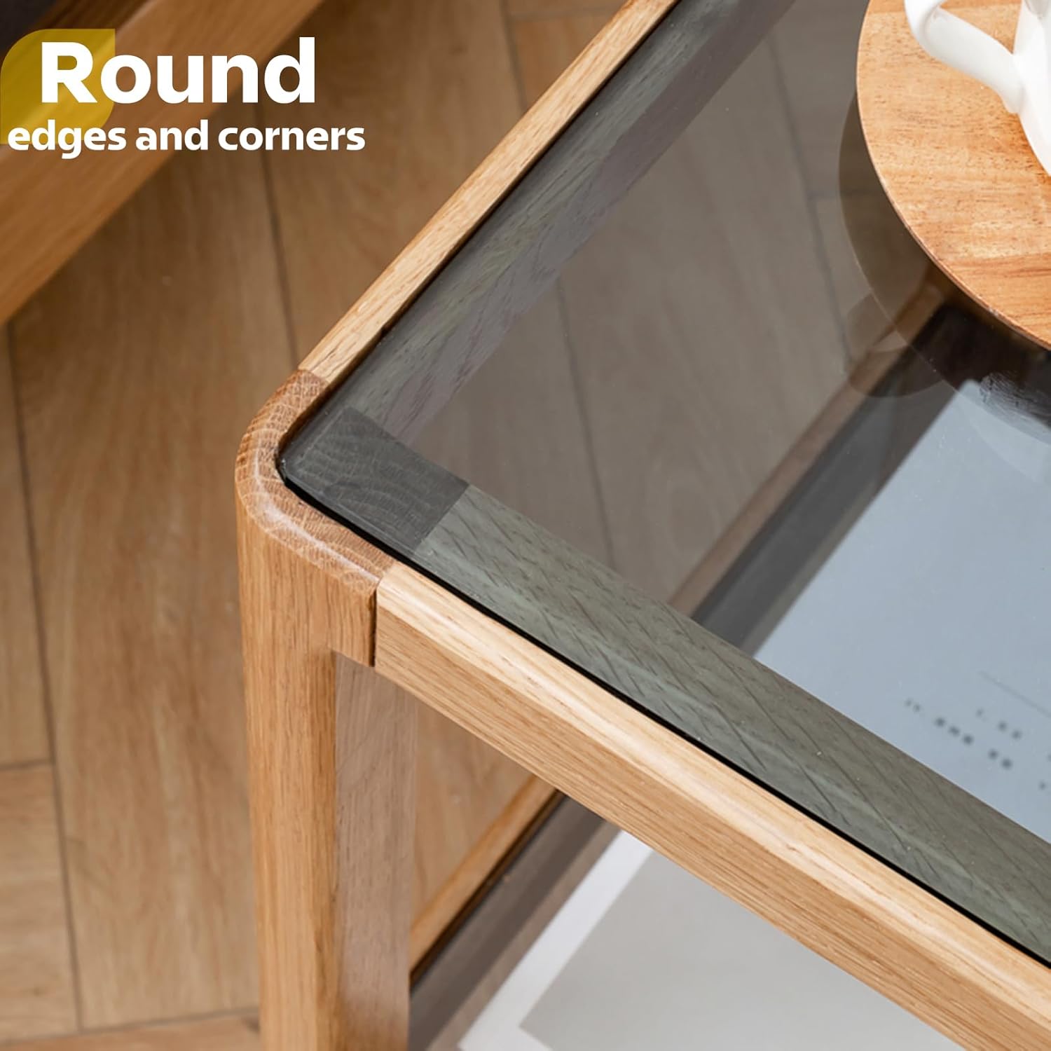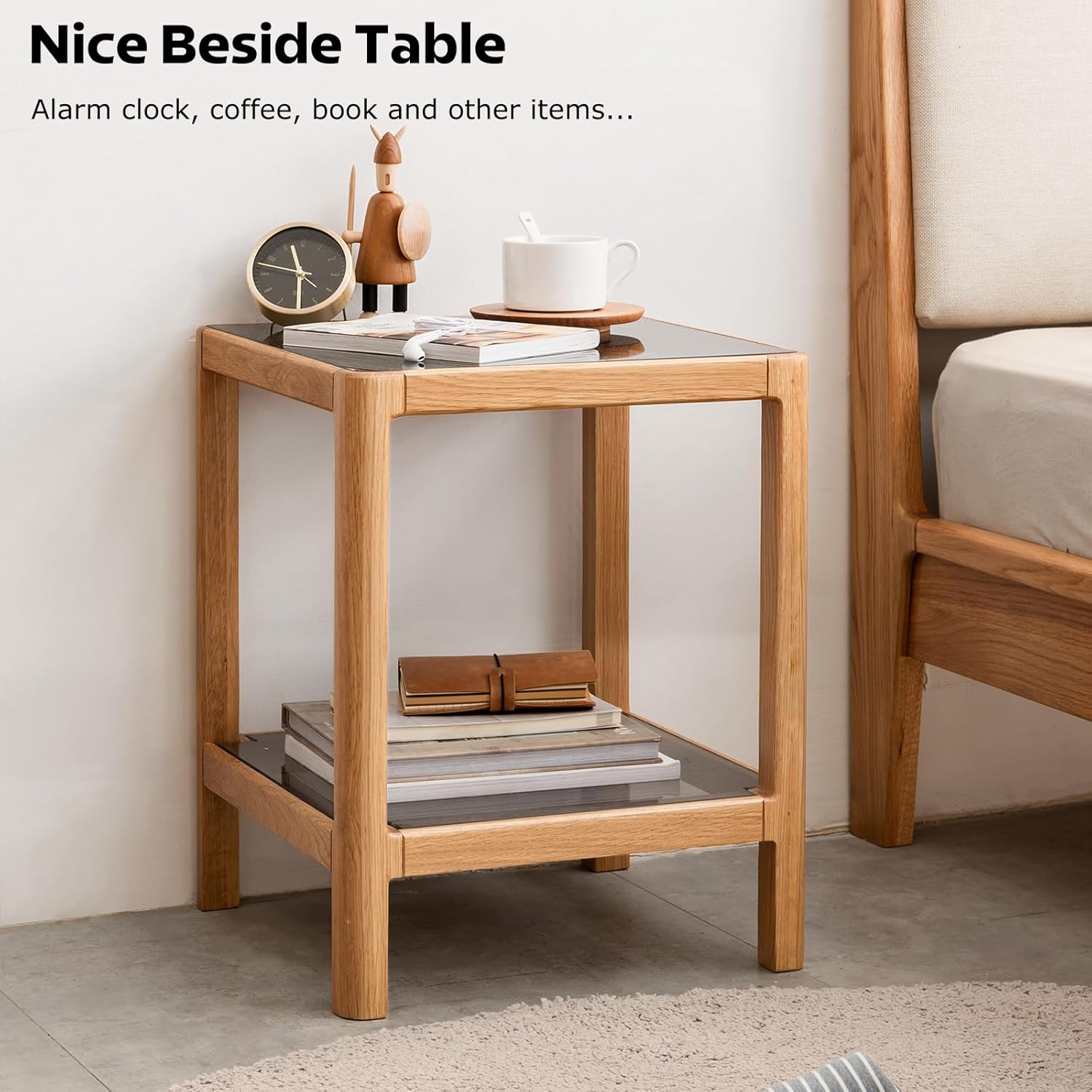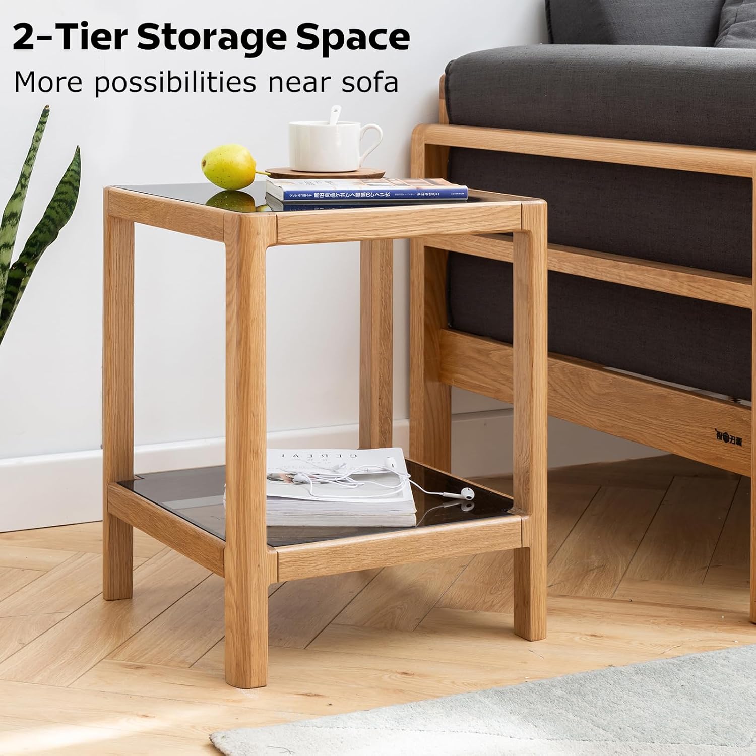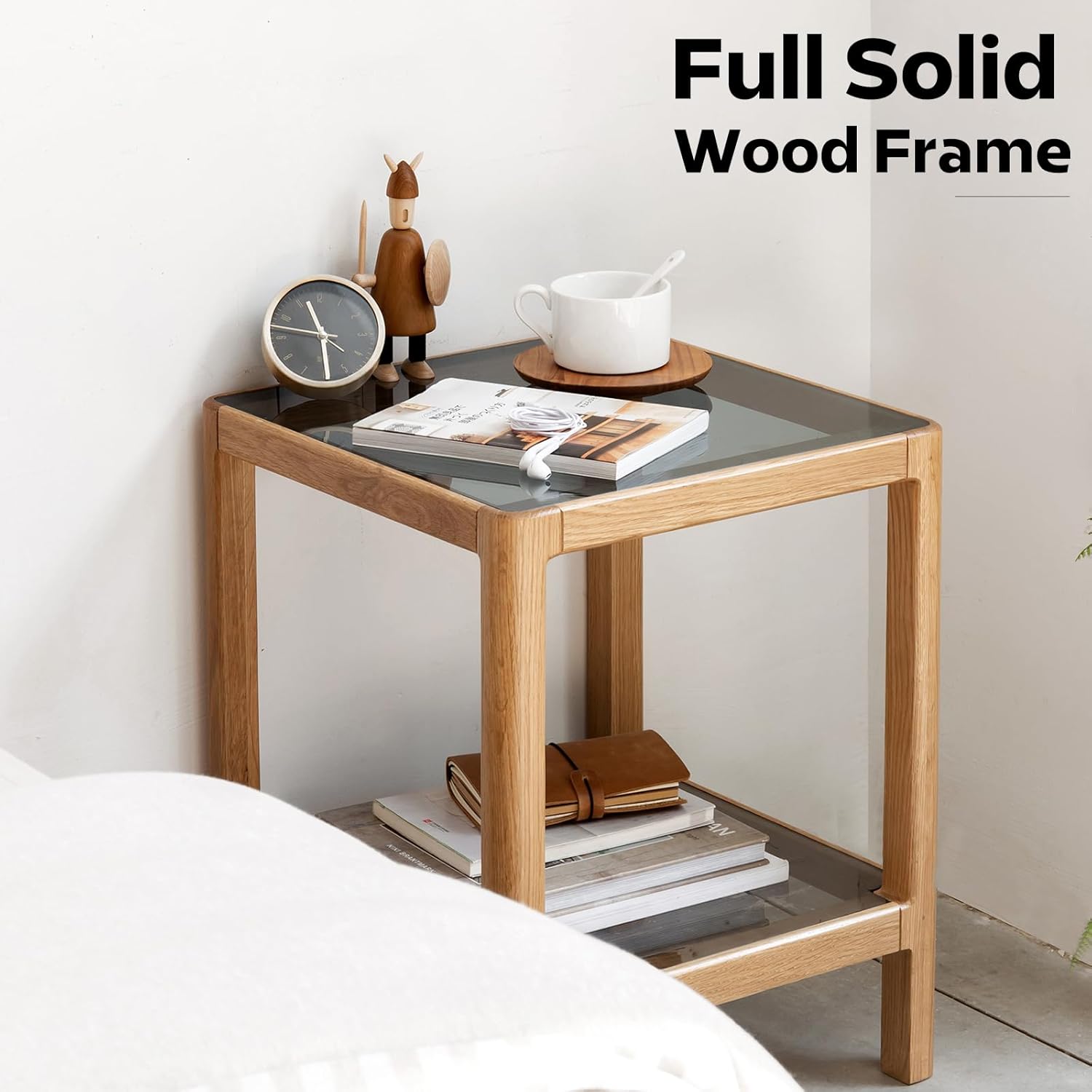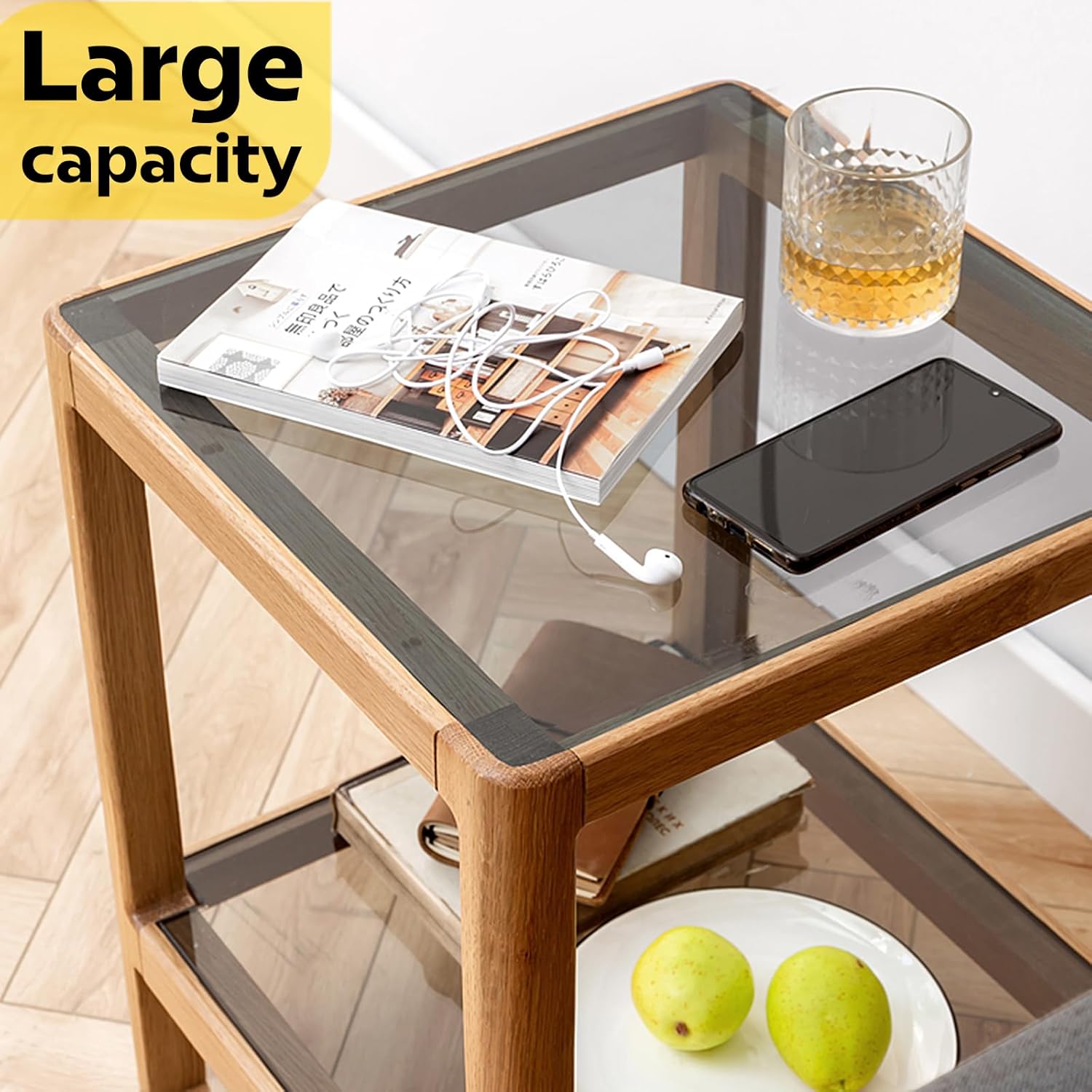 Square Glass Side Table with Solid Wood, 2-Layer Glass Modern End Table Night Stand Sofa Table for Living Room Bedroom