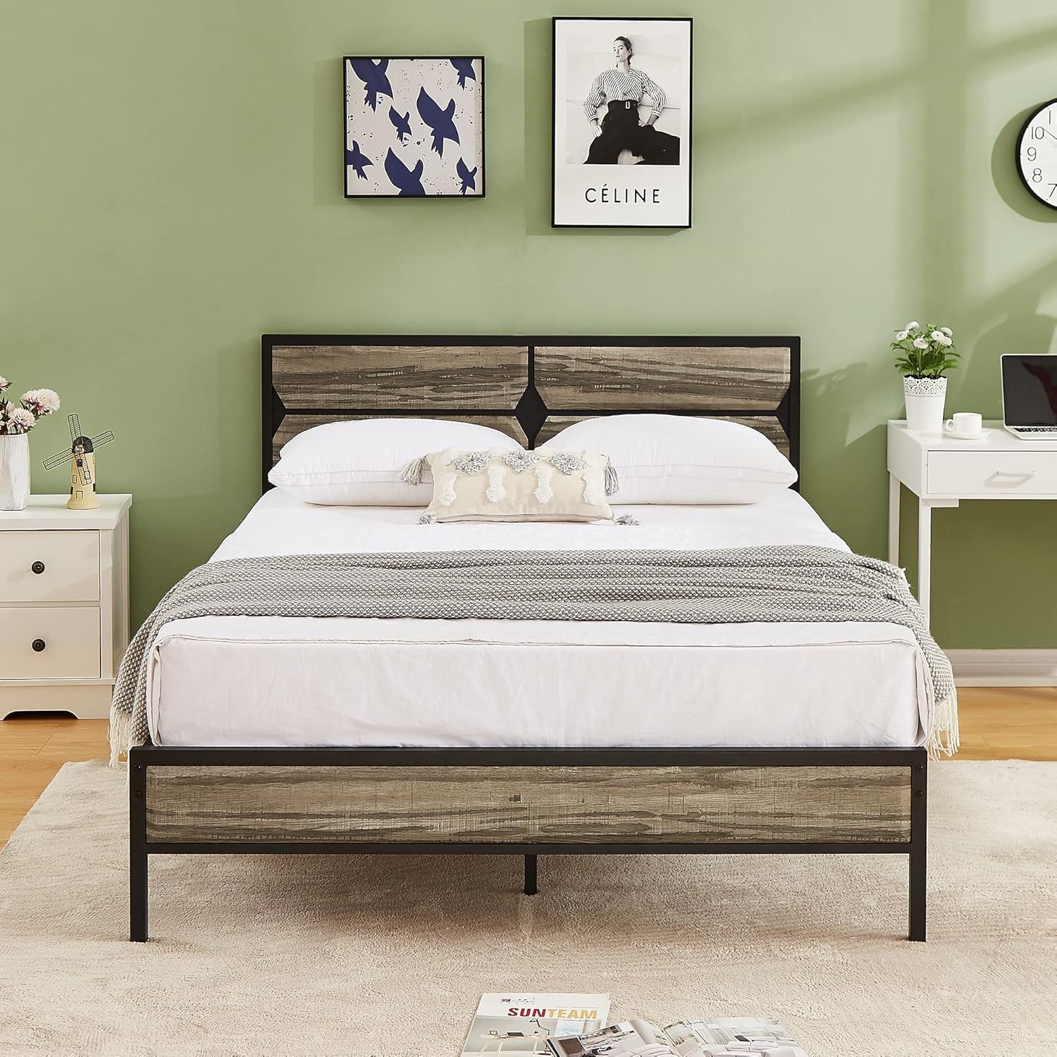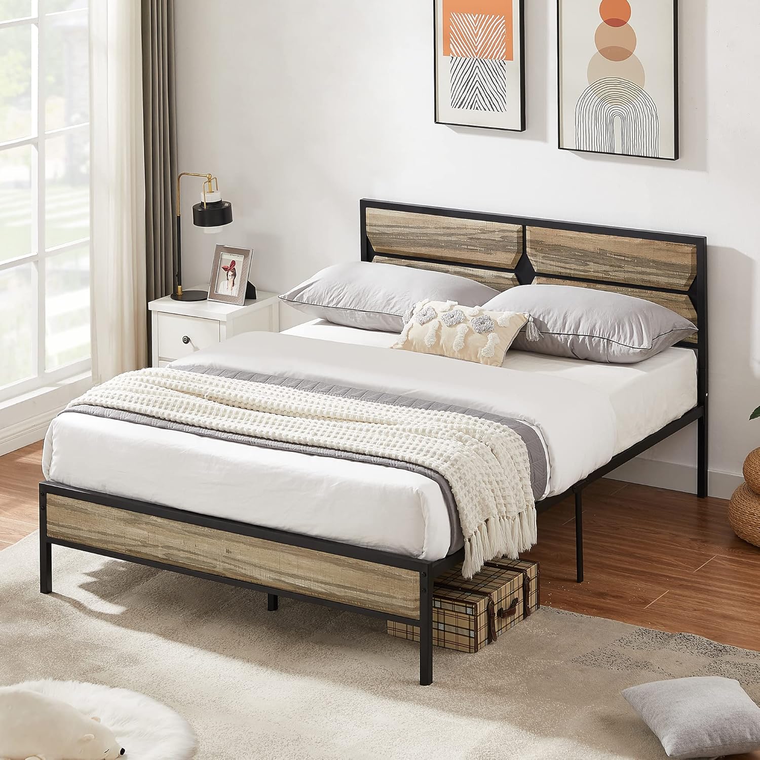VECELO Full Bed Frame Heavy Duty Metal Platform with Wooden Headboard Footboard Mattress Foundation 12 Strong Steel Slats Support Under Bed Storage/Easy Assemble