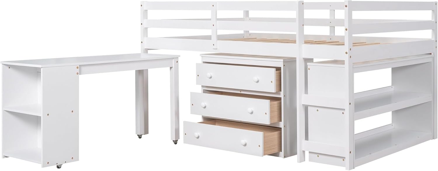 Full Size Low Loft Bed Wood Study Bedframe with Storage Cabinet Desk White Modern Contemporary Rustic Unisex Nature Space Natural Finish Hidden Includes Hardware