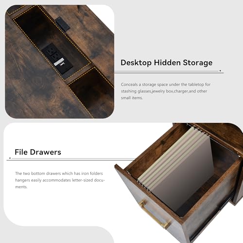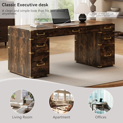 70"Classic and Traditional Executive Desk with Metal Edge Trim, Writing Desk with 2 file Drawers, USB Ports and Outlets, Desk with Hidden Compartment for Living Room Home Office Study Room, Black
