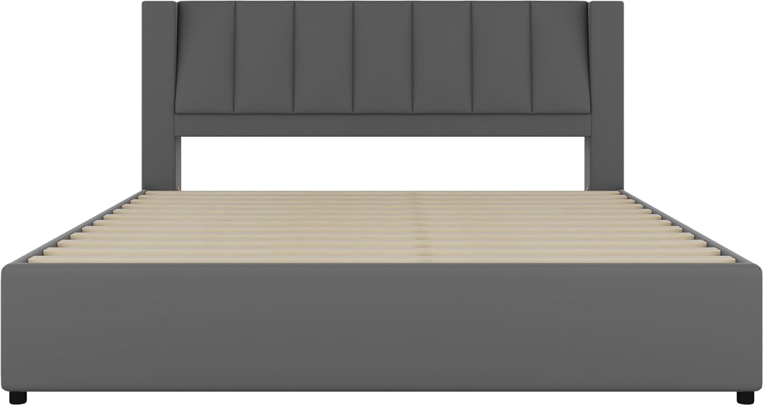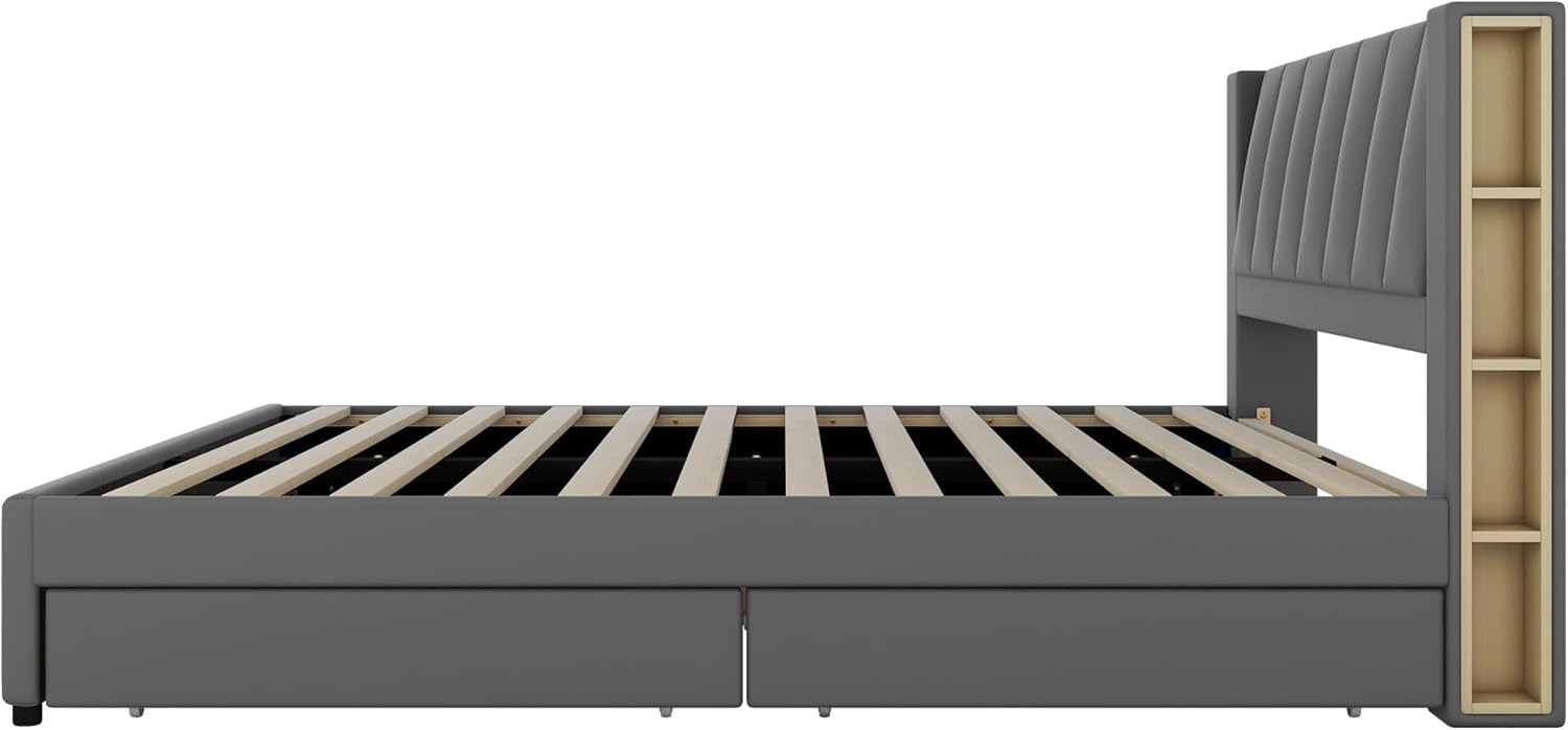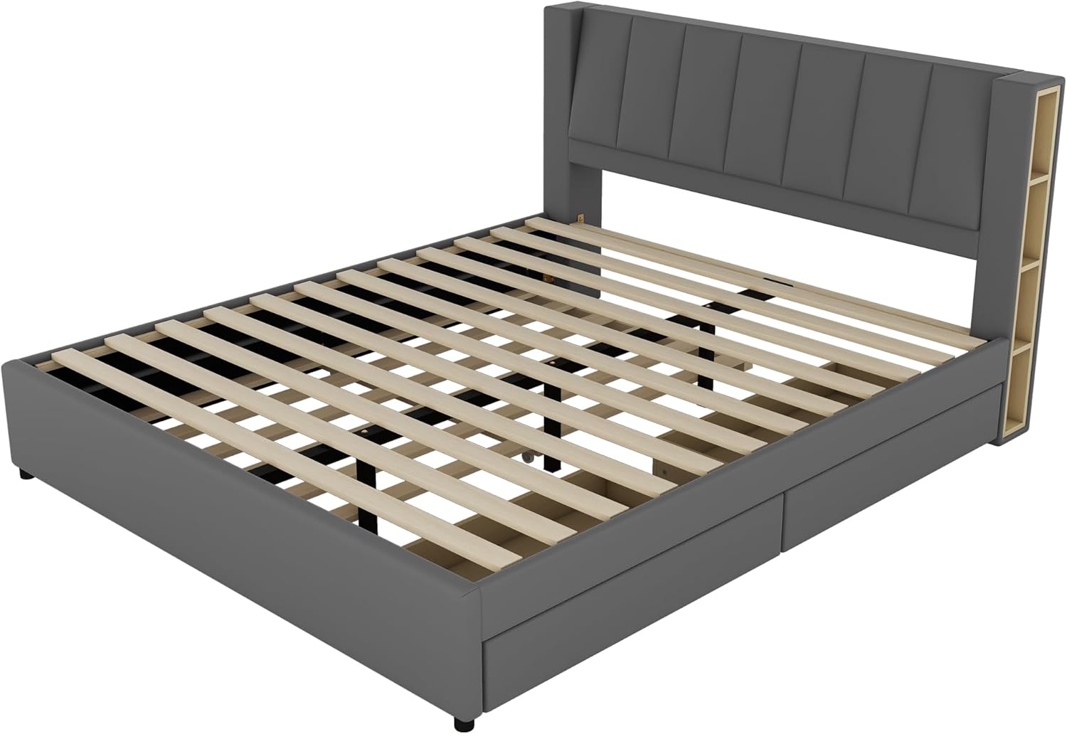 Frame jhnbvv King Size Upholstery Platform Headboard, 2 Drawers and Trundle, Vertical Access Bed Large Storage Space Saving, Wooden Slat Support, No Box Spring Needed,Gray