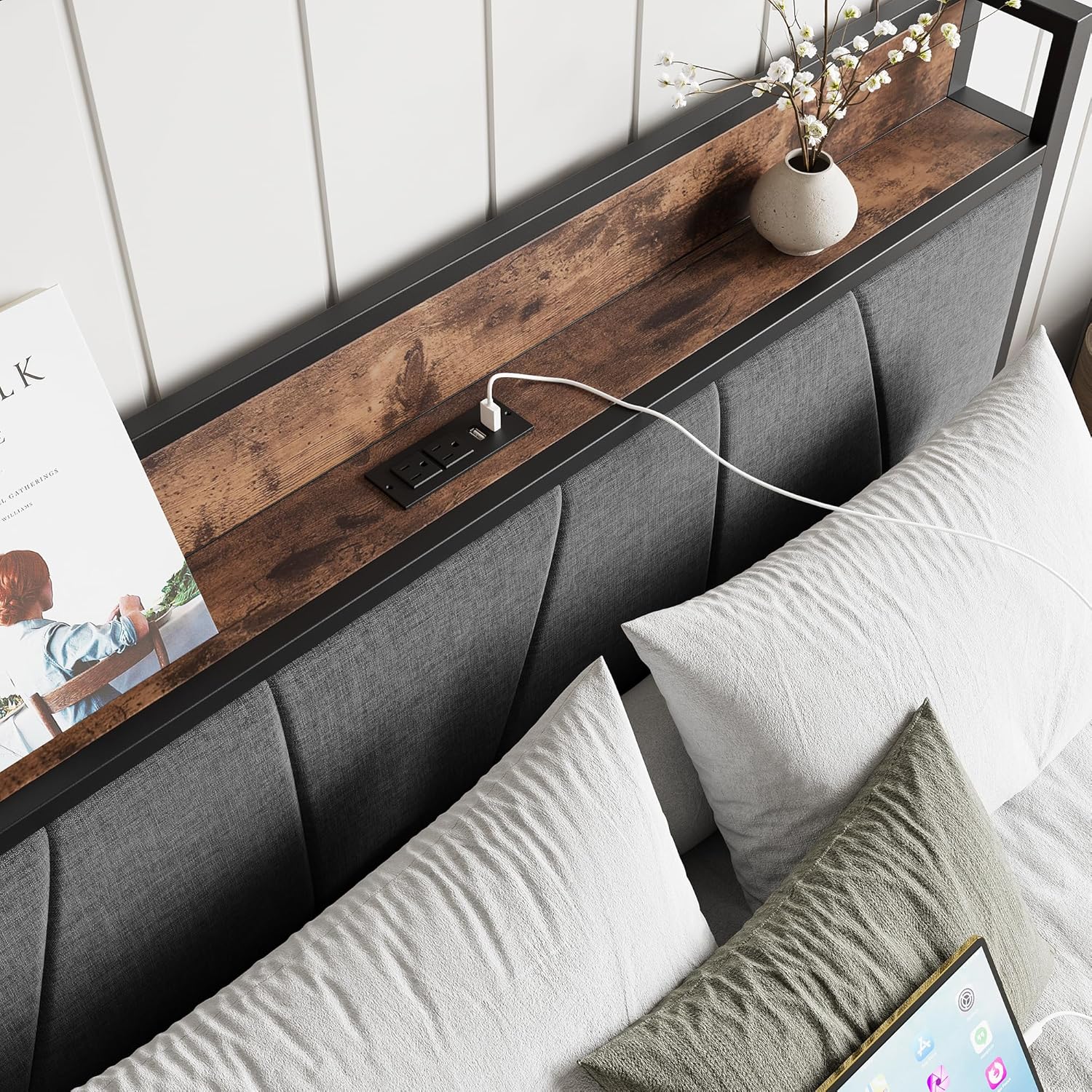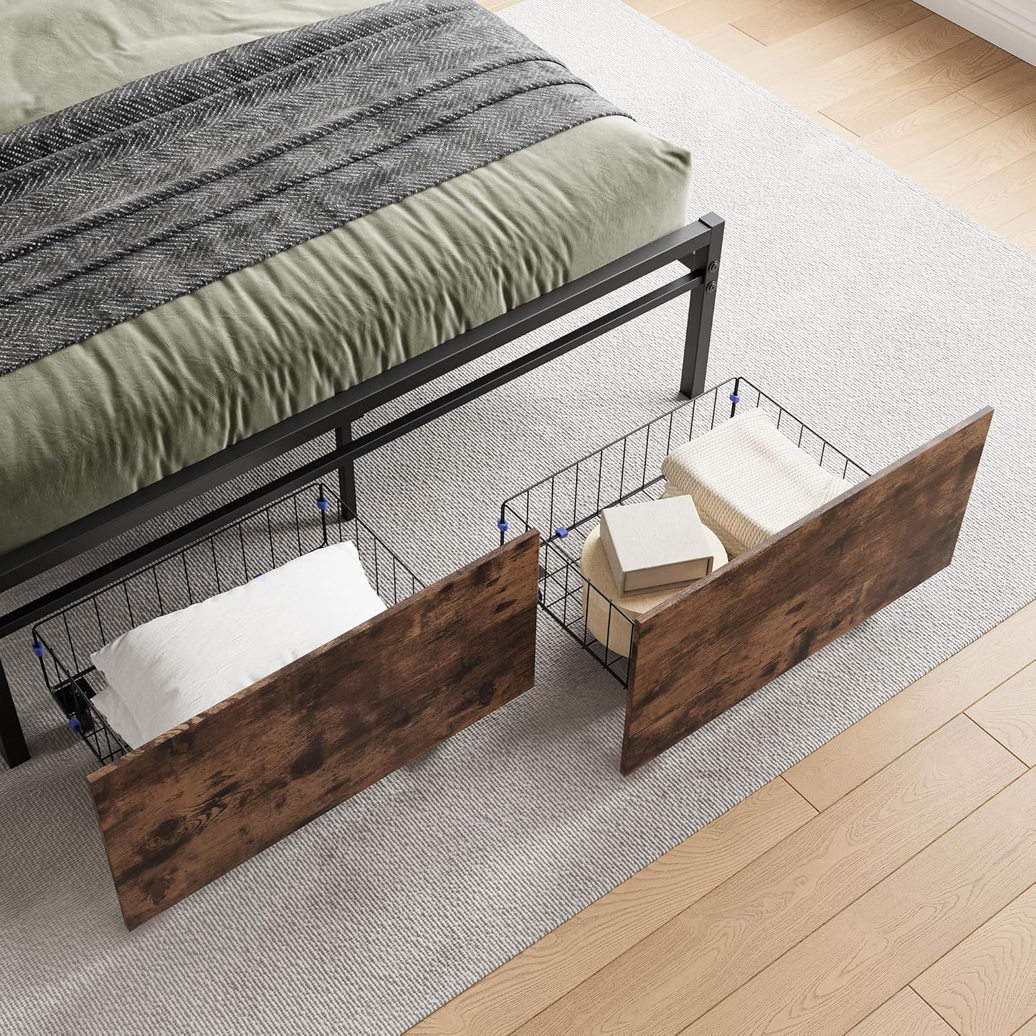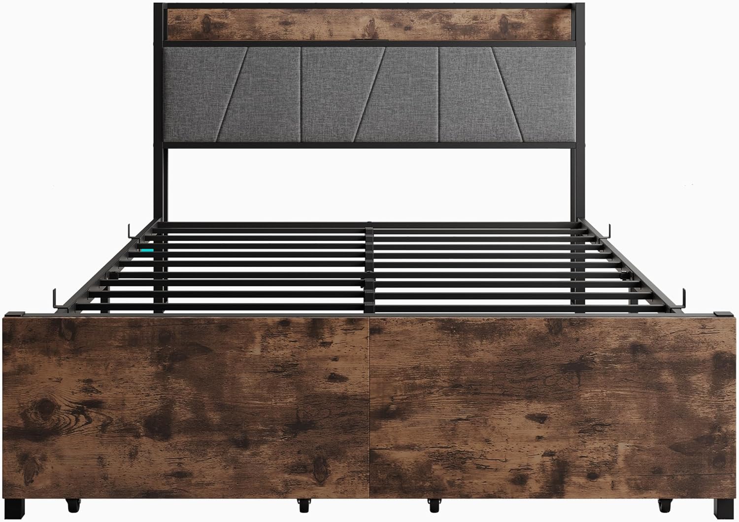 Full Size Metal Platform Bed with 2 Under Bed Storage Drawers, Storage Headboard with Charging Station Design, Heavy Duty Slats Support Bedframe, Vintage Brown+Gray