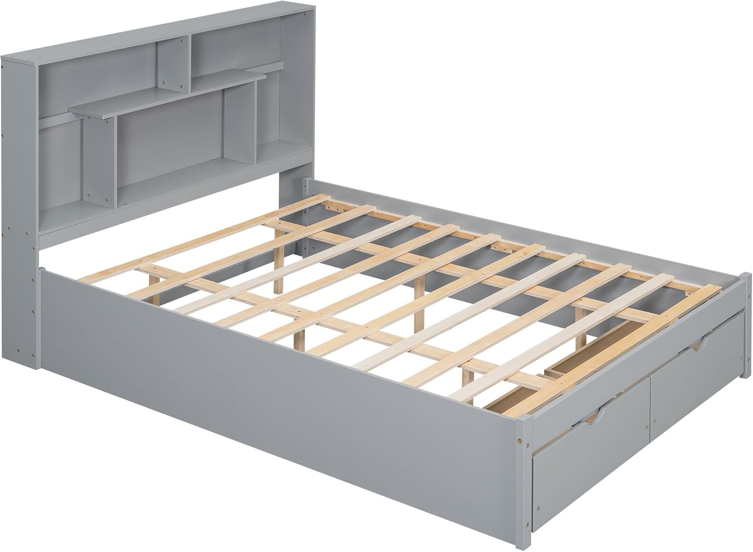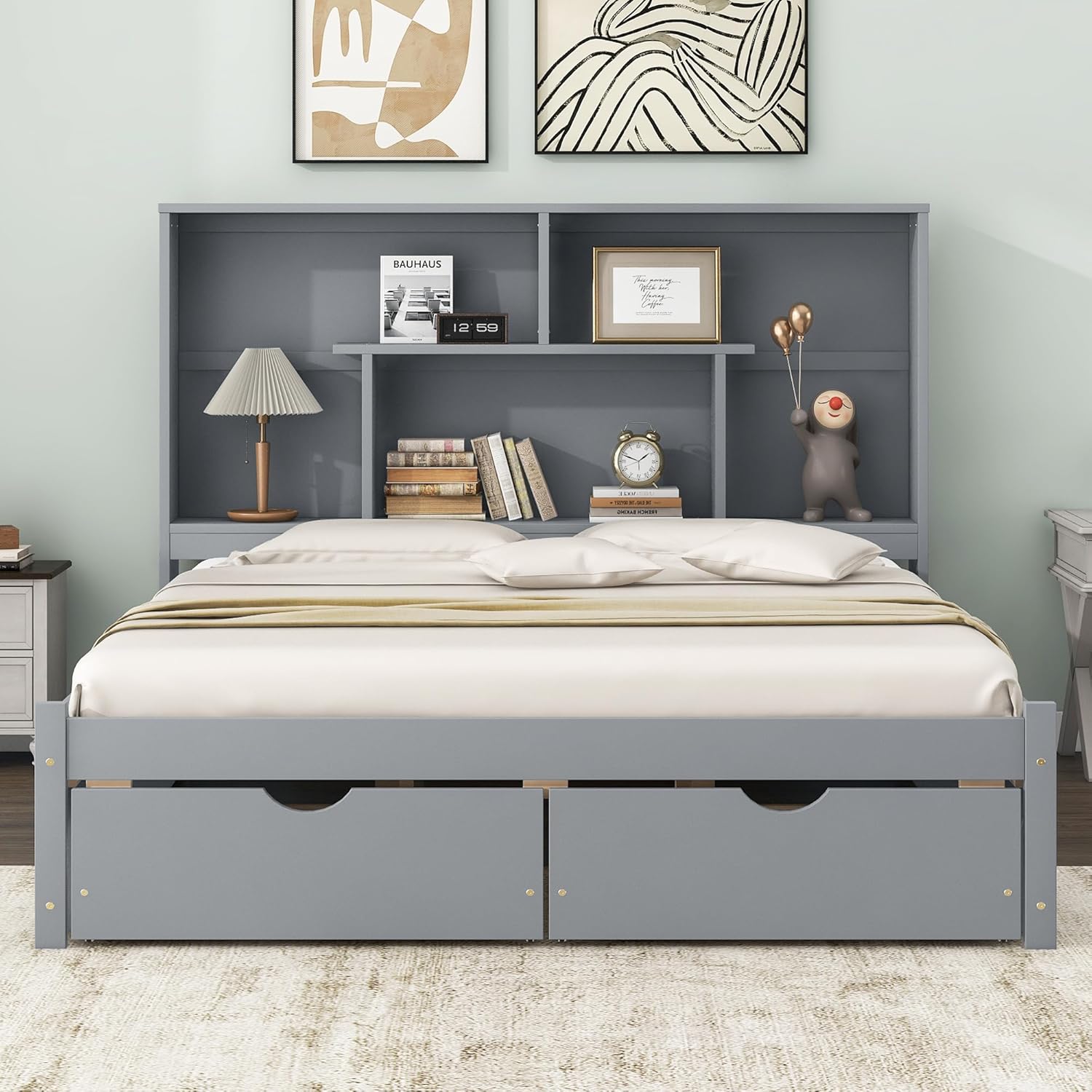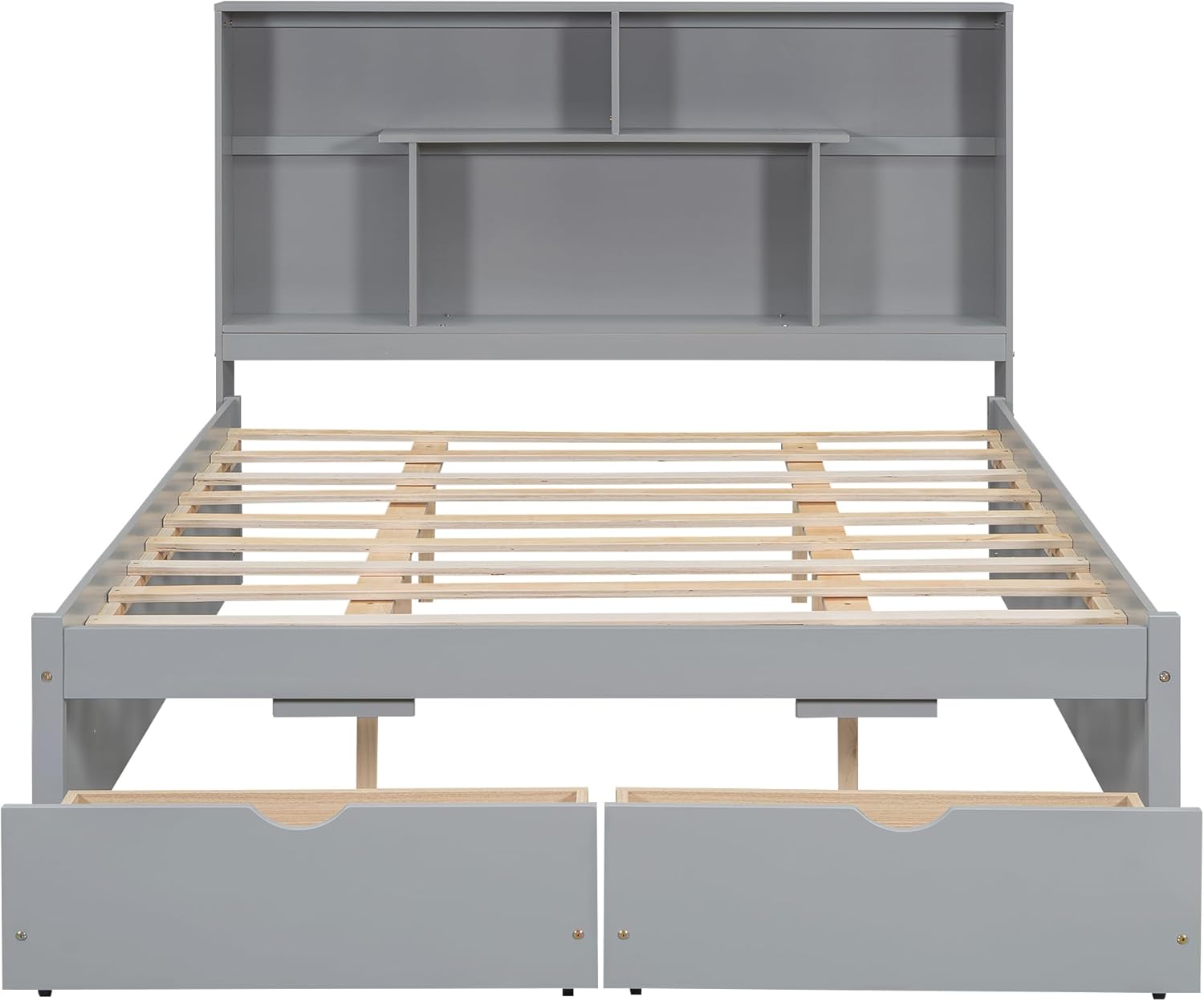 Queen Size Bed Frame, Wooden Platform Bedframe with Bookcase Headboard and 2 Storage Drawers, No Box Spring Needed, Gray