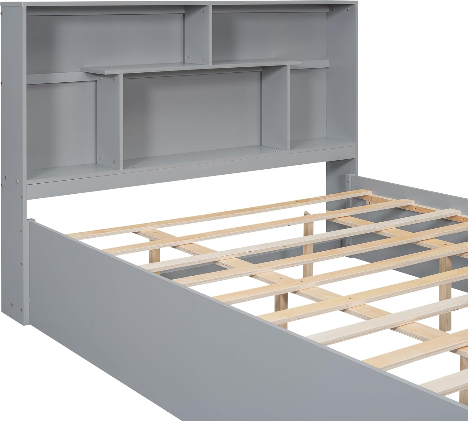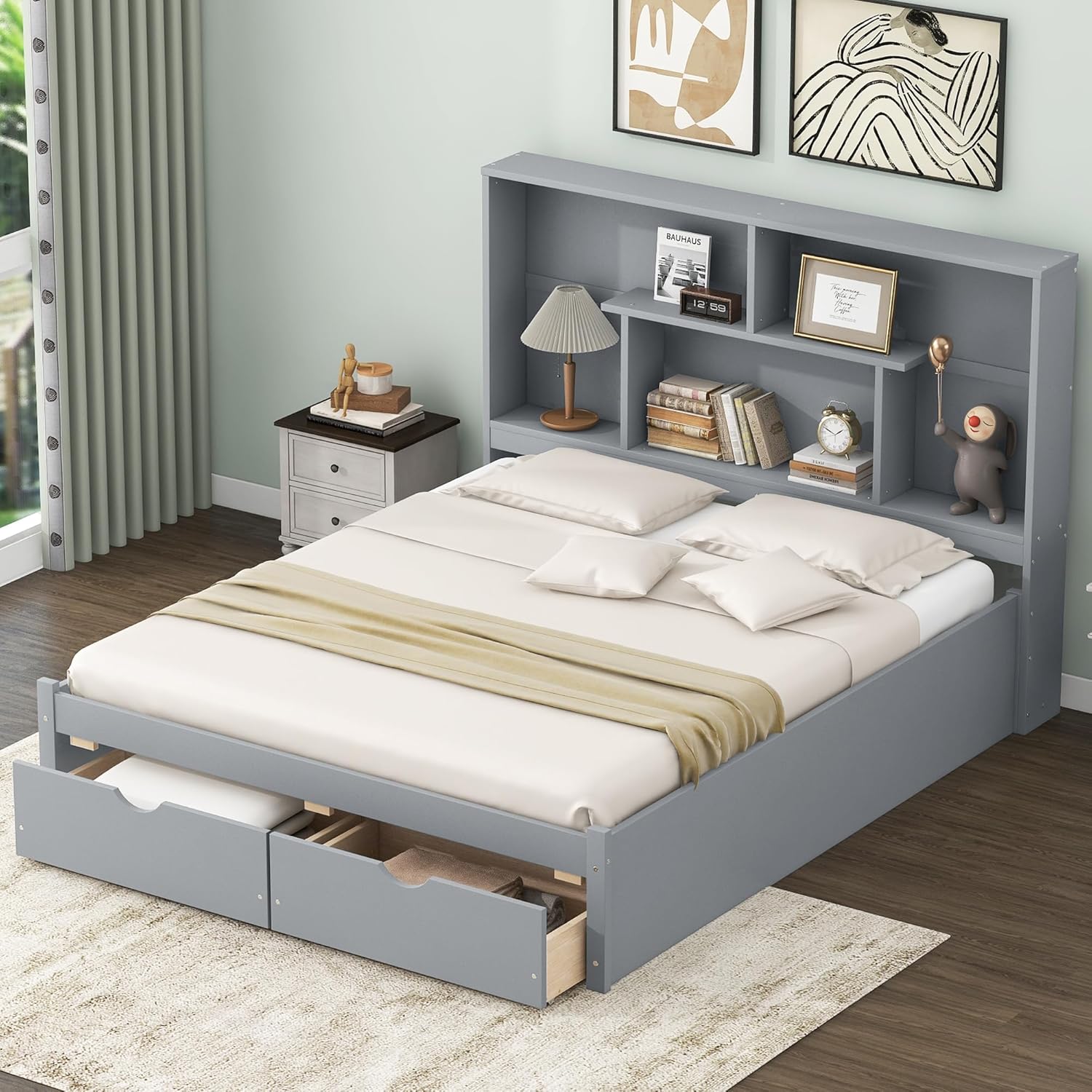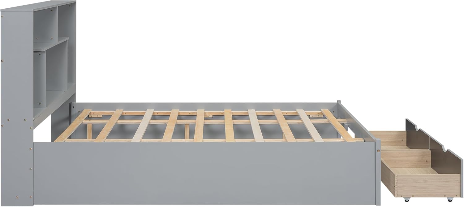 Queen Size Bed Frame, Wooden Platform Bedframe with Bookcase Headboard and 2 Storage Drawers, No Box Spring Needed, Gray