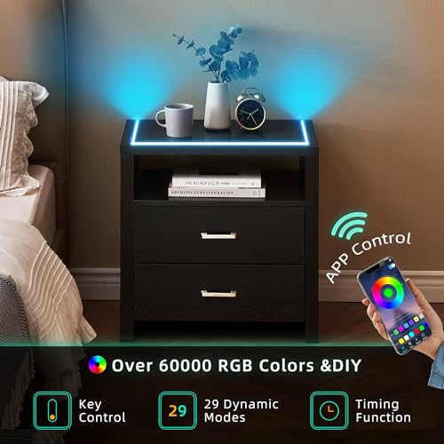 Furnulem Nightstand with Storage Drawer, Tall Dresser for Bedroom with Led Light and Charging Station, Side Table Nightstand for Closet, Fabric Bins, Metal Frame, Wood Shelf