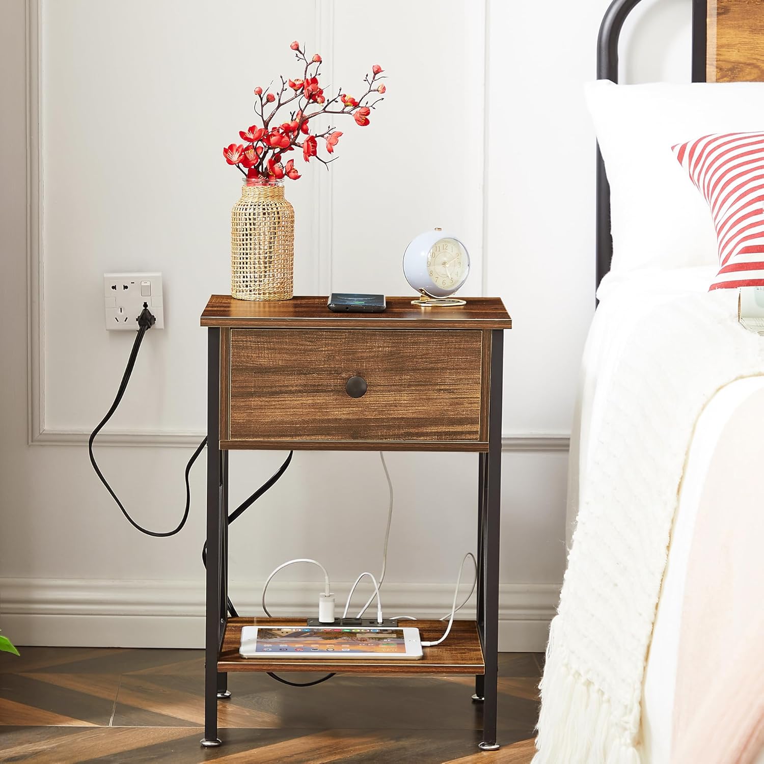 VECELO Nightstands, Modern Bedside End Tables with Charging Station & Drawers & USB Ports, Night Stand for Bedroom Living Room, 1 Pack (with Outlets), Retro Brown/1pcs