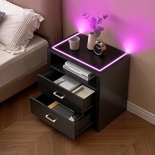 GAOMON White Nightstand with LED Lights, Modern Night Stand with 2 Storage Drawer and Open Storage, End Side Table for Bedroom Living Room