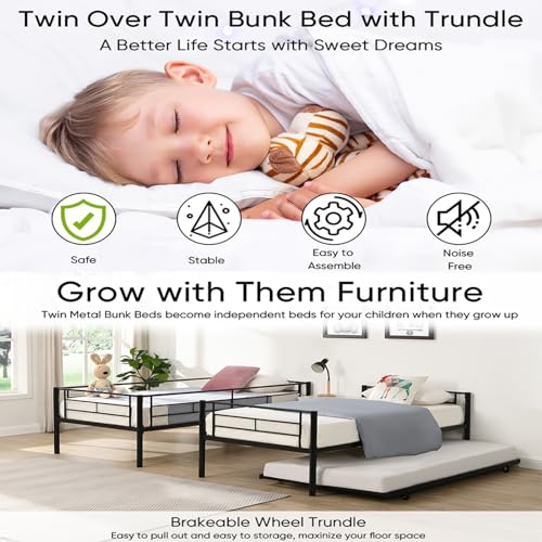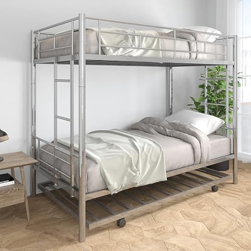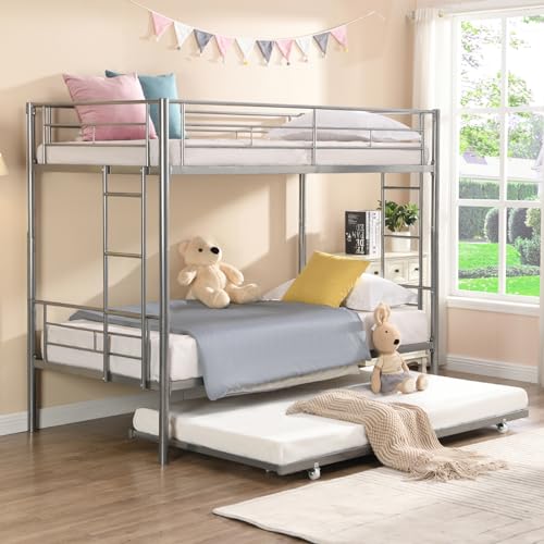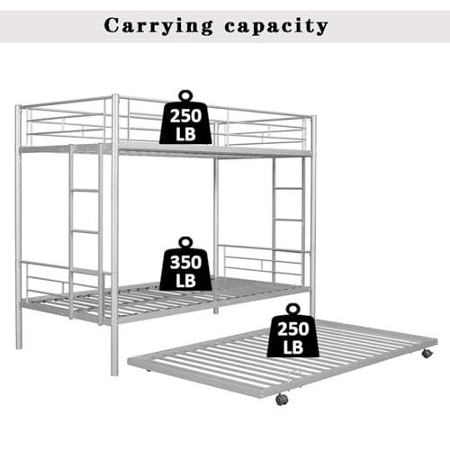 Metal Twin Over Twin Bunk Beds,with Trundle,for Kids Teens Adults, Heavy Duty Bunk Bed,No Box Spring Needed(Silver)