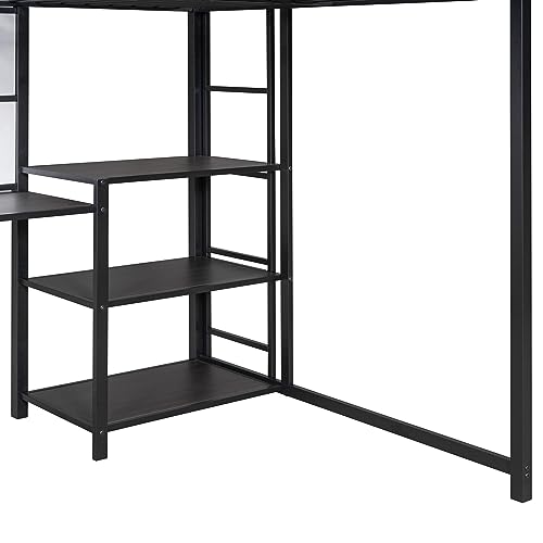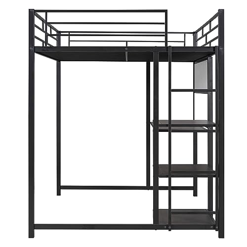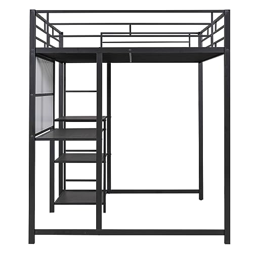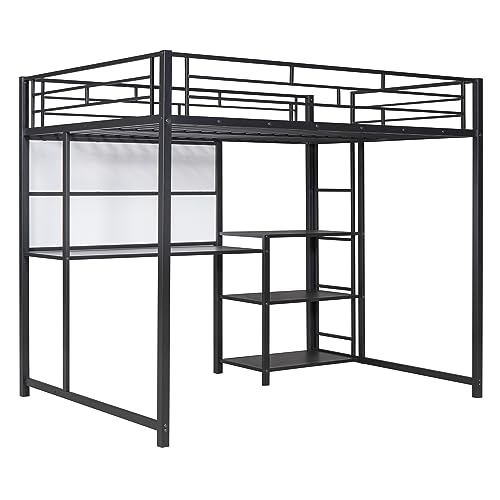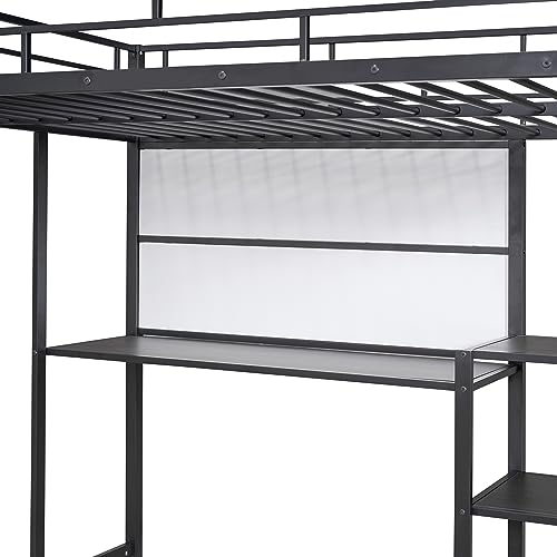 Merax Full Size Mental Loft Bed Frame with Desk and Whiteboard,3 Shelves and Ladder for Bedroom for Boys Girls Adult,Black