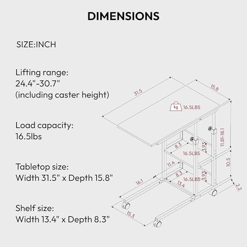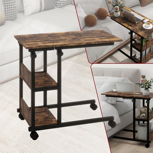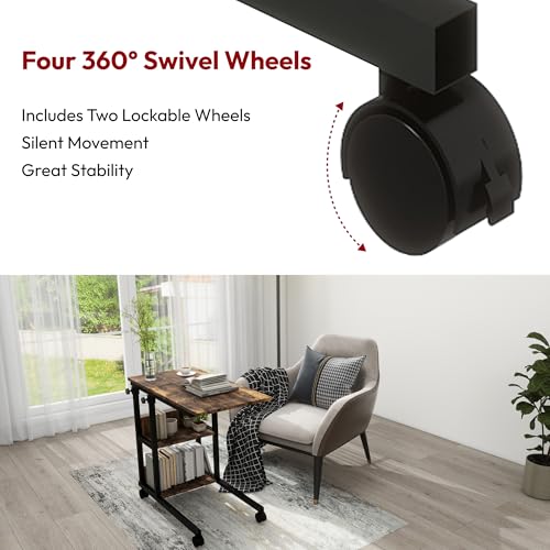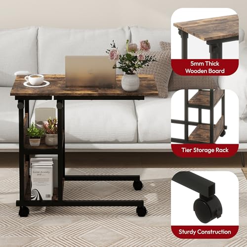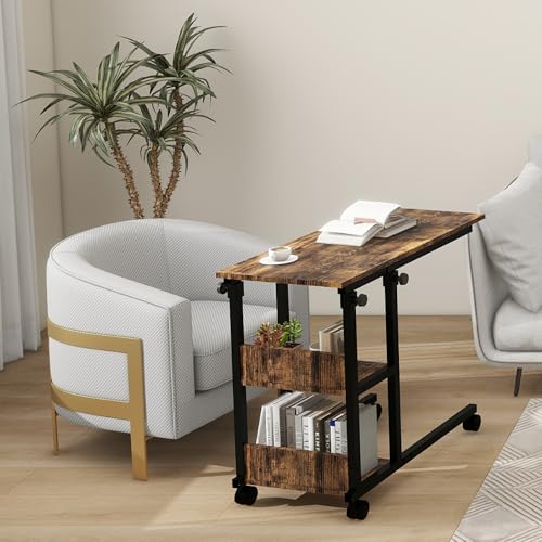 SANODESK Height Adjustable C-Shaped End Table with Wheels, Side Table Couch Table with Storage Shelves End Table TV Tray Table for Living Room, Bedroom,Small Space, Sofa Bedside Table,Black