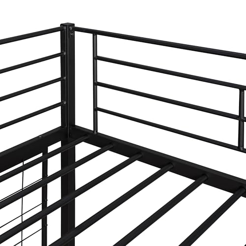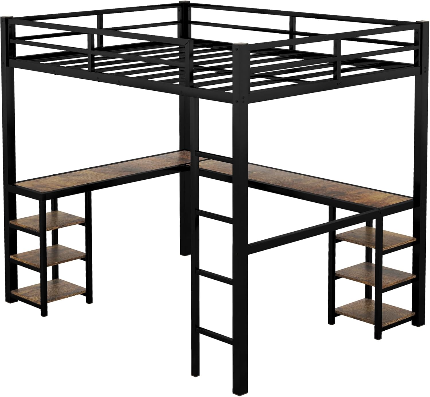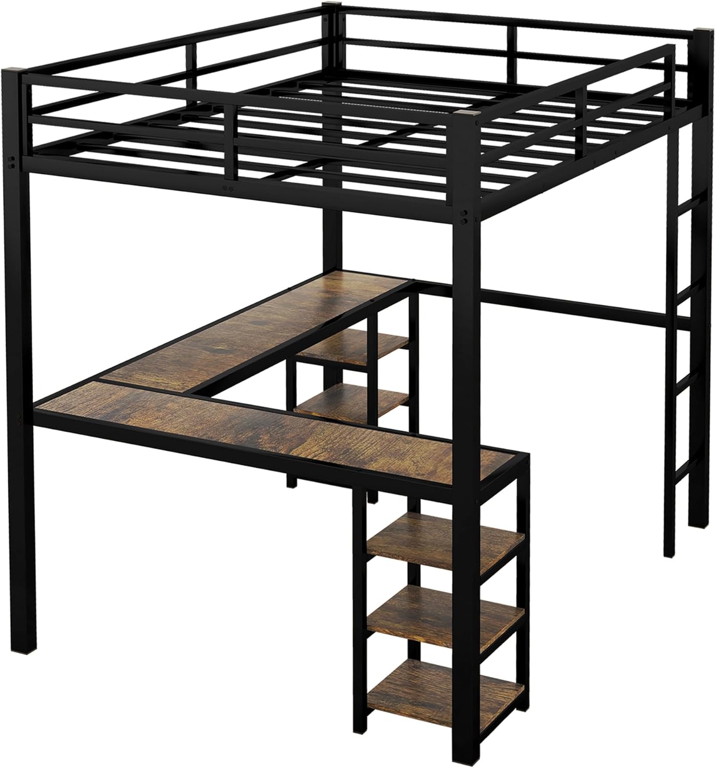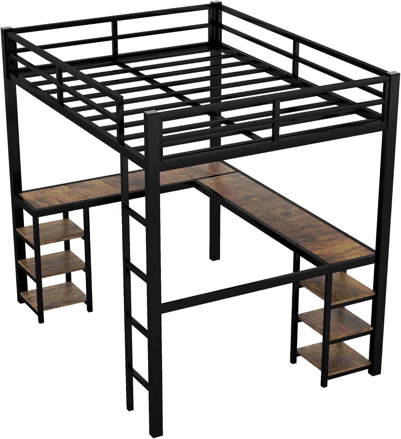 CITYLIGHT Full Size Loft Bed with L Shaped Desk and Storage Shelves Metal Full Loft Bed with Built-in Ladders and Guardrails, Noise Free, No Box Spring Needed (Full, Black)