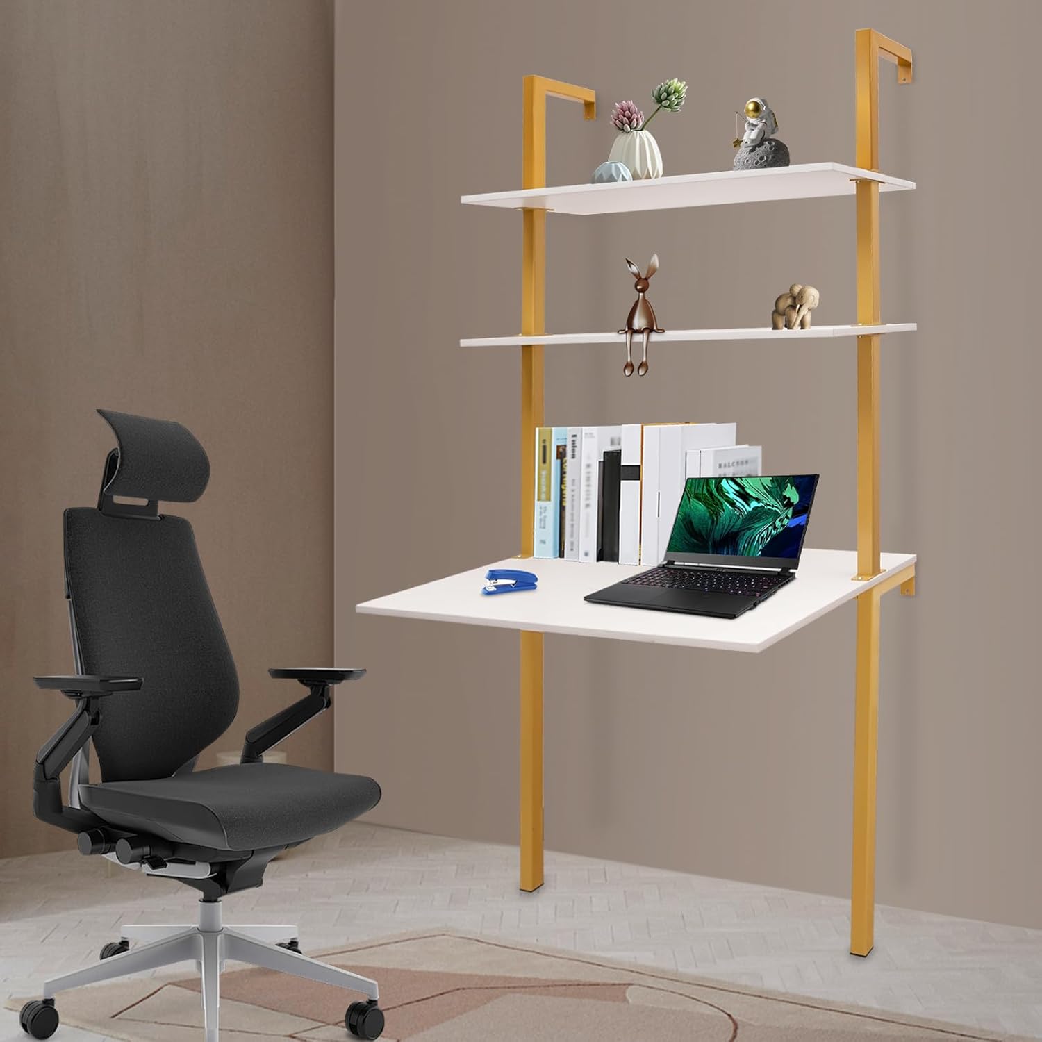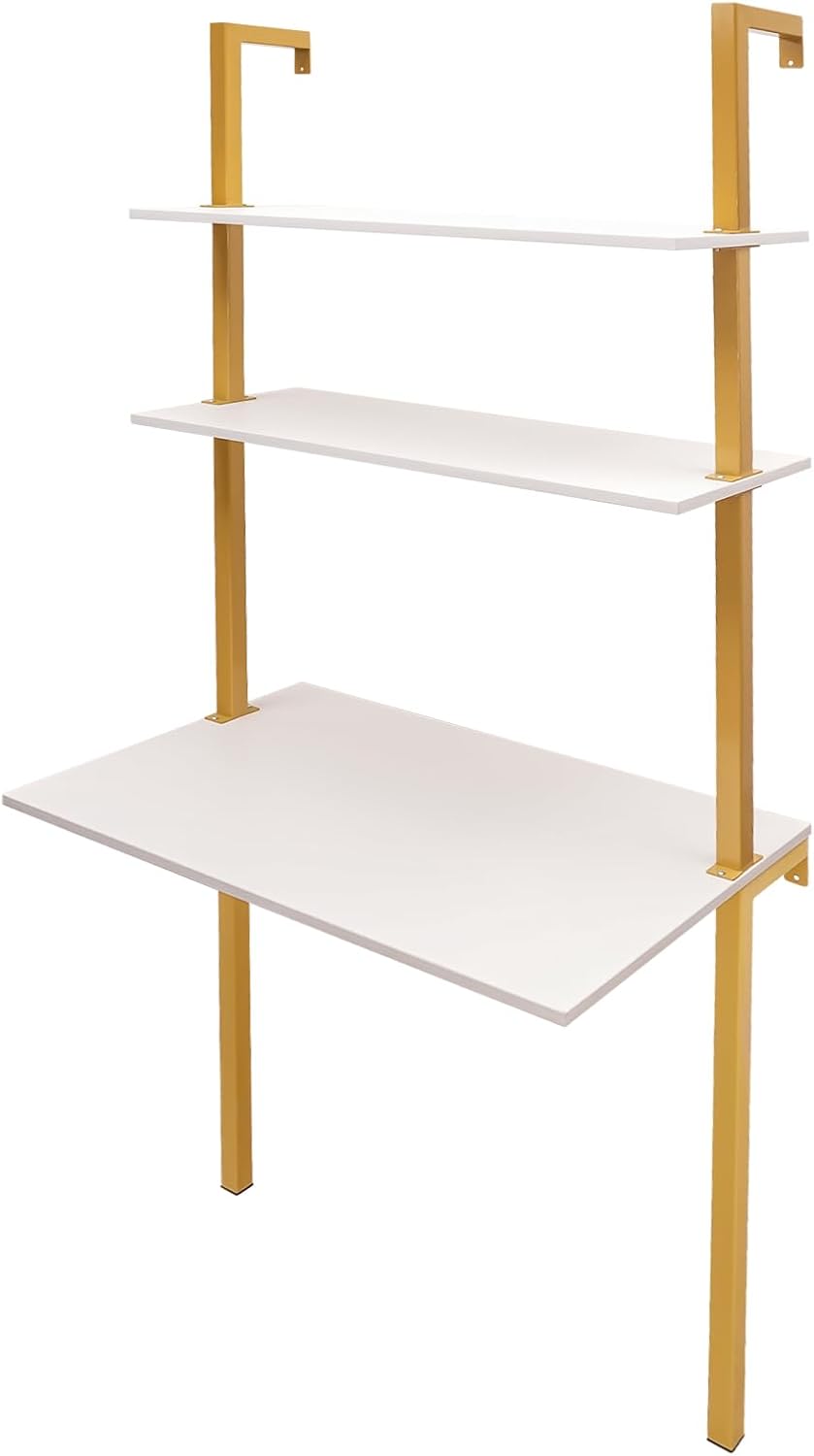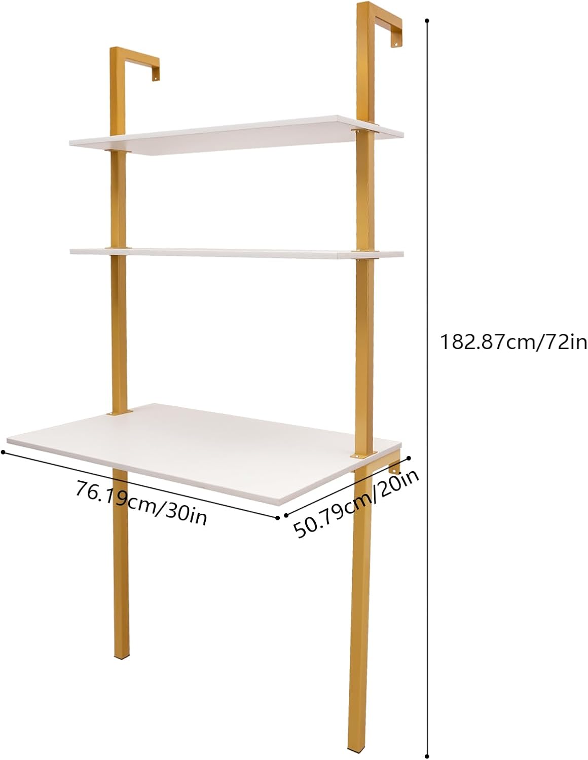 Wall Desk, 3 Tier Ladder Computer Desk, Industrial Desk with Shelves and Power Strip, Wall Mounted Table Shelf Floating Table(20" D x 30" W x 72.8" H), Gold, White