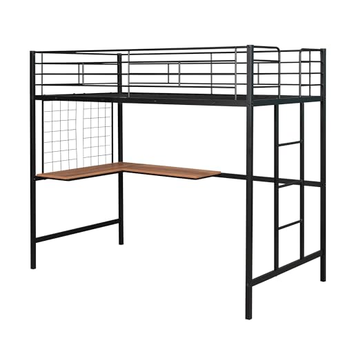 Full Size Metal Loft Bed with Built-in Desk and Storage Shelf, Heavy Duty High Loft Bedframe w/Wider Ladder & Safety Guardrails, No Box Spring Needed, for Kids Teens Adult