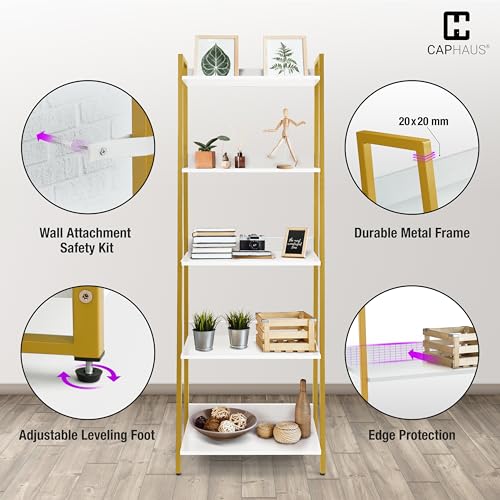 CAPHAUS 24 Inch Width 5-Tier Ladder Shelf, Free Standing Bookcase with Open Shelves, Storage Rack Organizer, Industrial Book Shelves for Living Room, Home Office, Kitchen, White Wooden Shelves