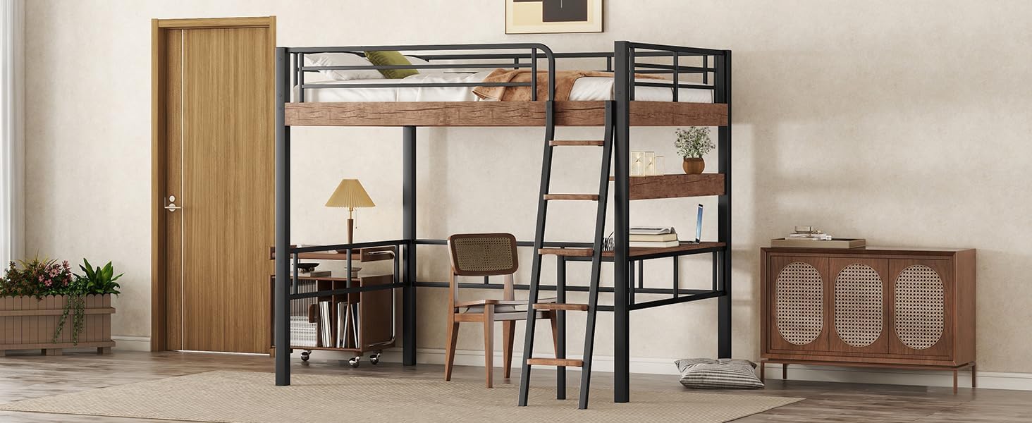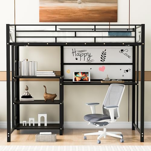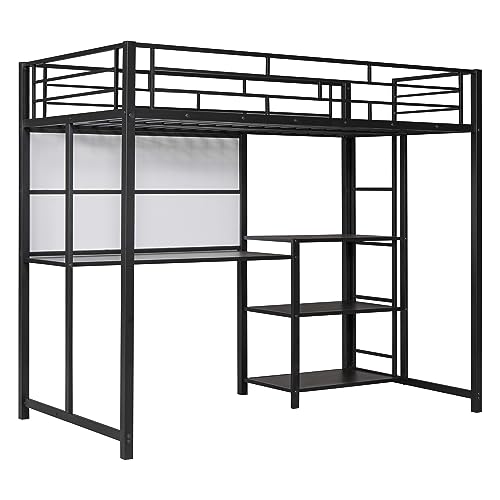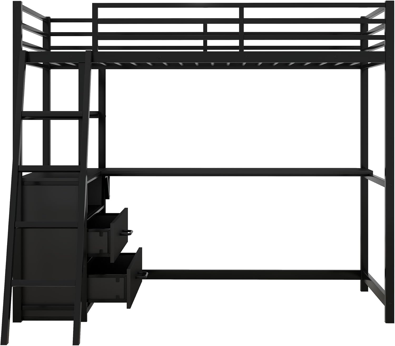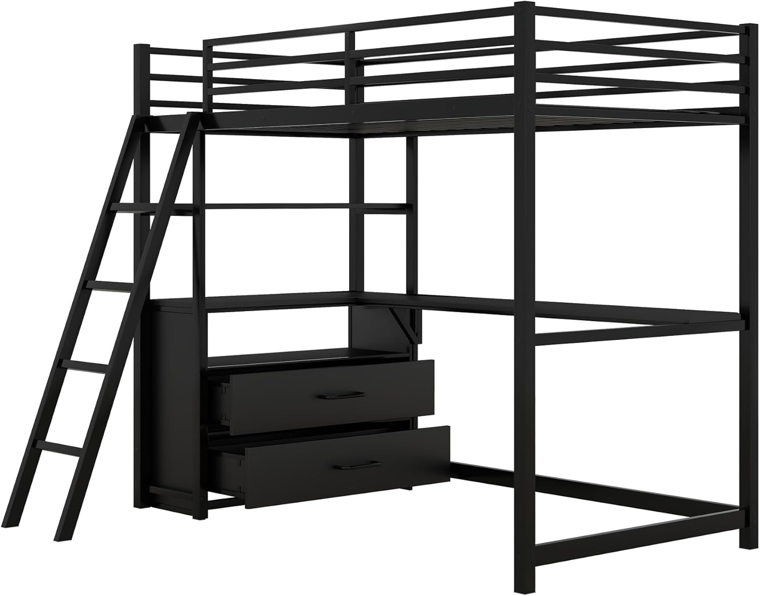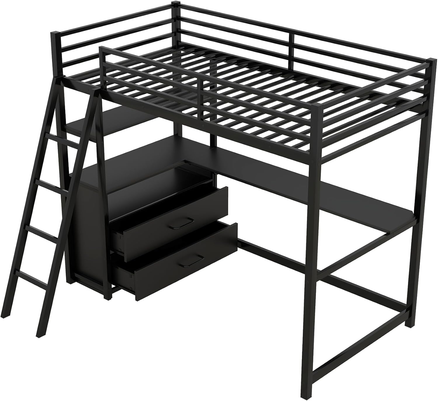 Twin Size Loft Bed with Desk and Storage Drawers, Metal&Wood Loft Bed with Desk and Shelves, Heavy-duty Loft Beds with Ladder for Kids Boys Girls Teens, Black