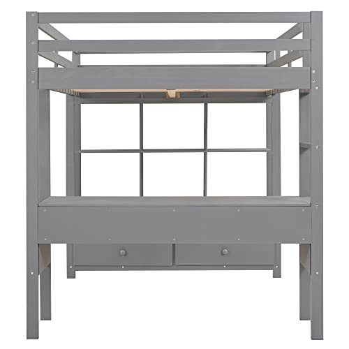 Full Loft Bed with Built-in Desk and Drawers for Storage, Solid Wood Loft Bed Frame for Kids Teens, Heavy Duty Bed Frame with Shelves, Ladder and Guardrail, White