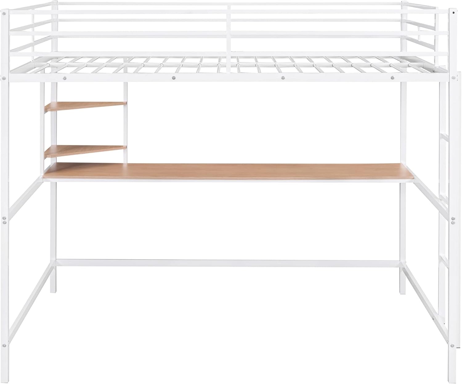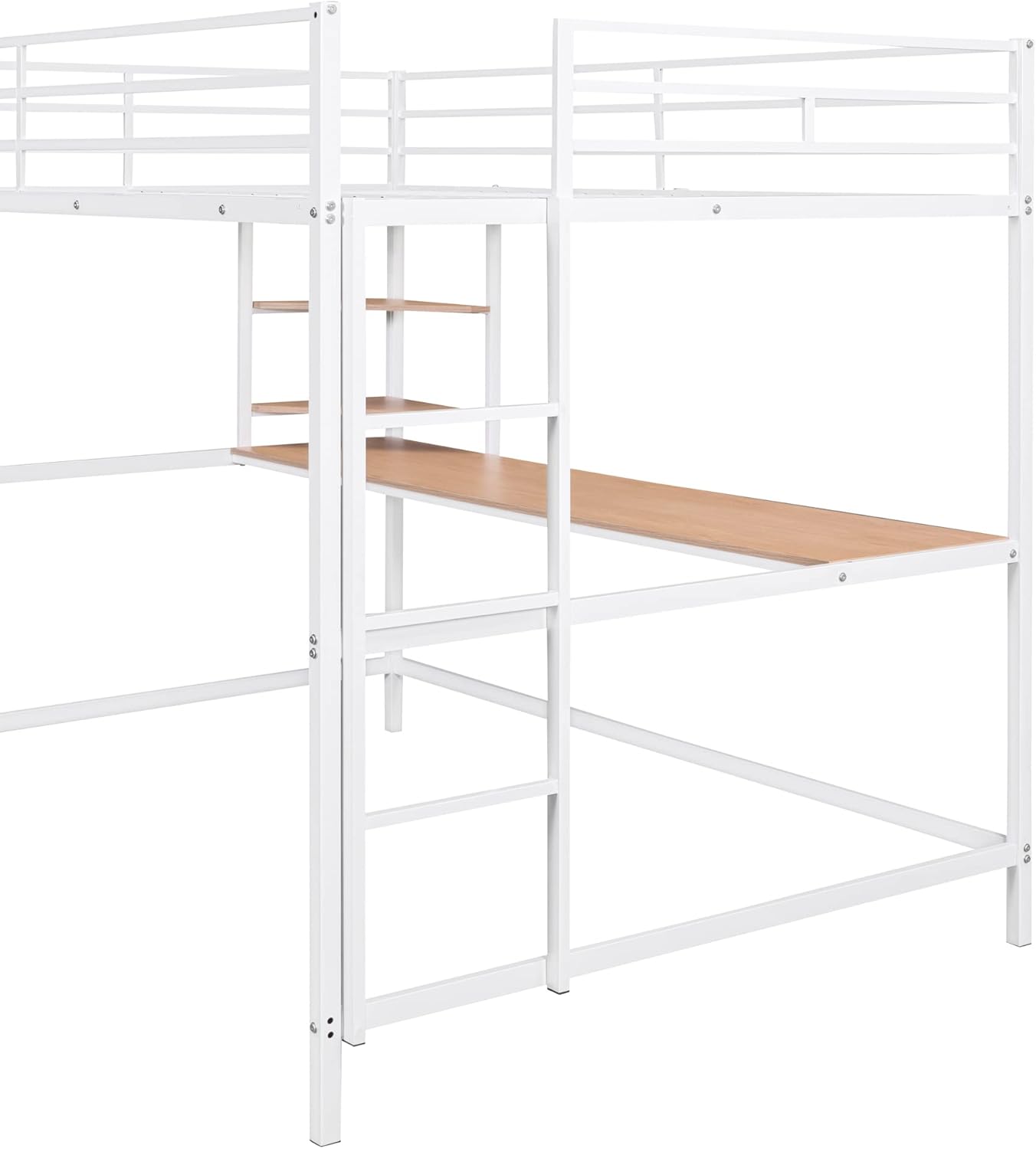 Full Size Bed for Kids & Teens, Multifunctional Metal Loft Bedframe with Built-in Desk & 2 Storage Shelves, Safe Guardrail & Ladder, Maximum Space Saving, No Box Spring Needed, White