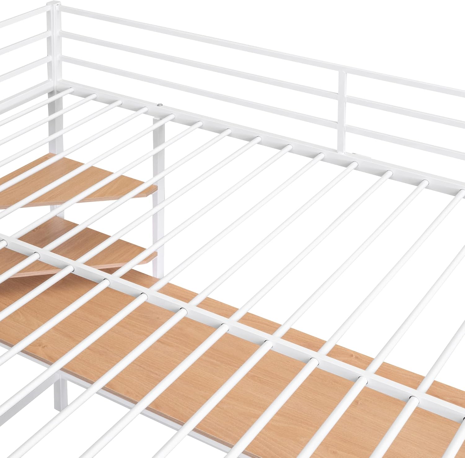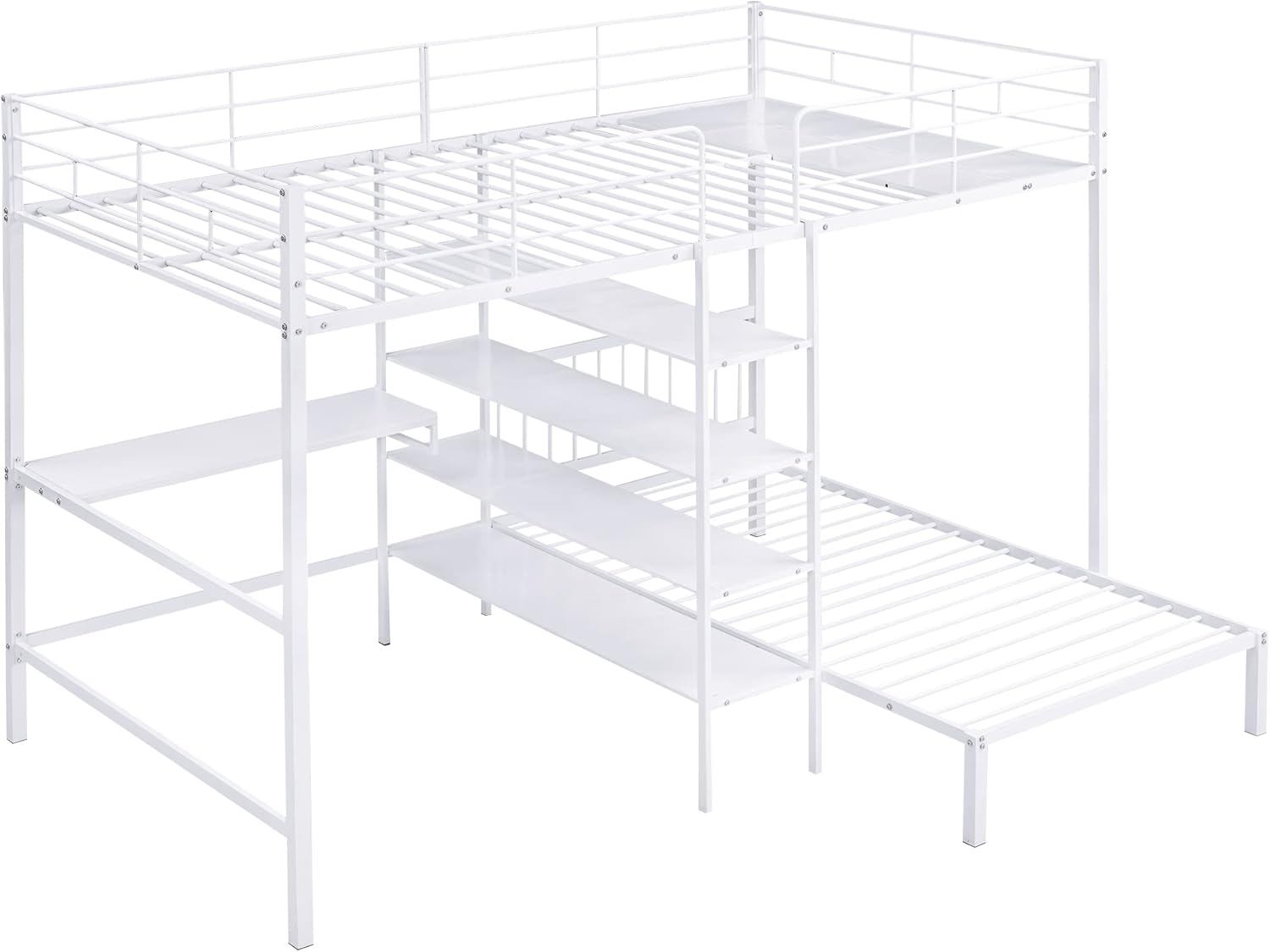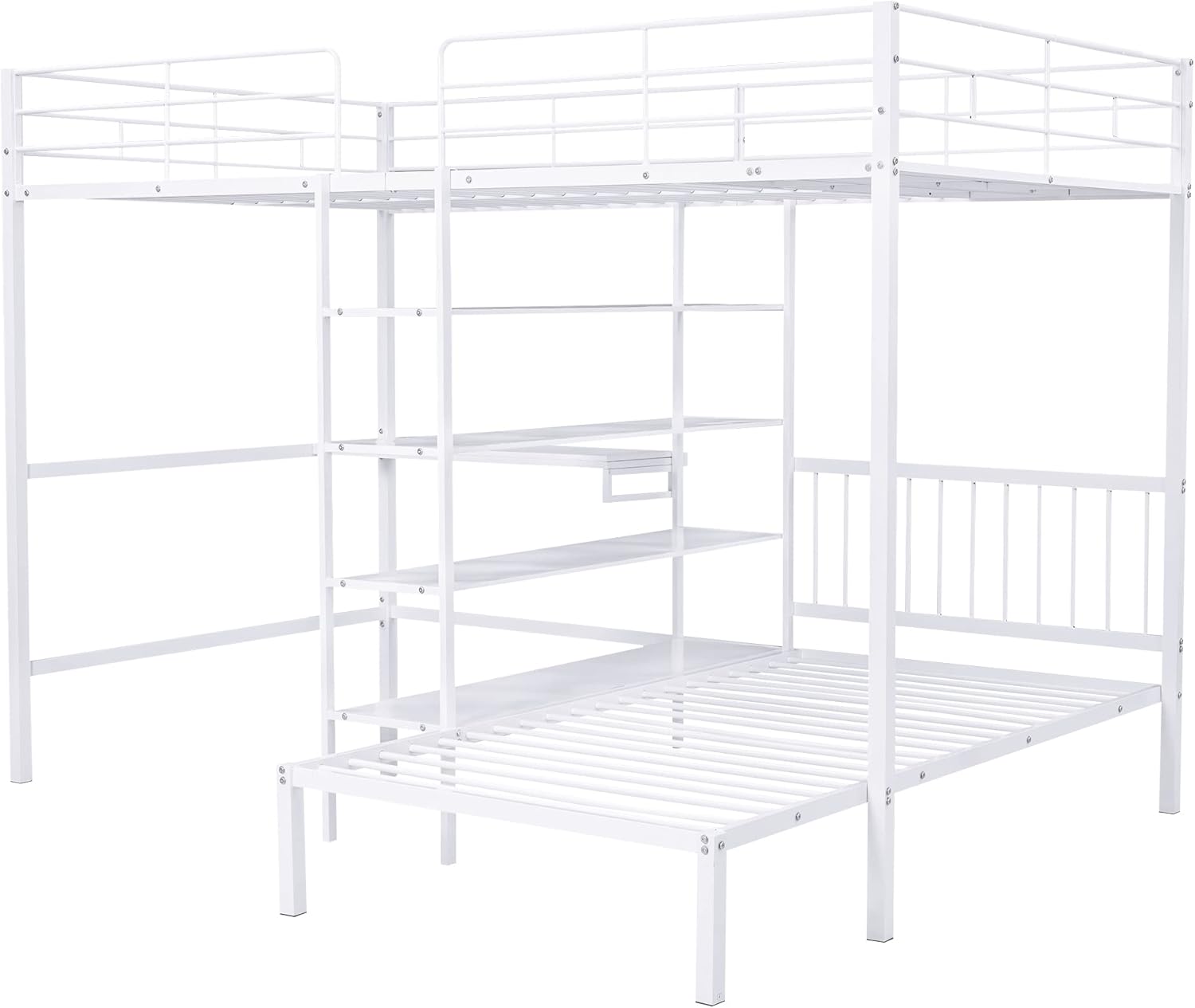 Full Over Twin Metal Bunk Bed with Built-in Desk, Shelves and Ladder, White