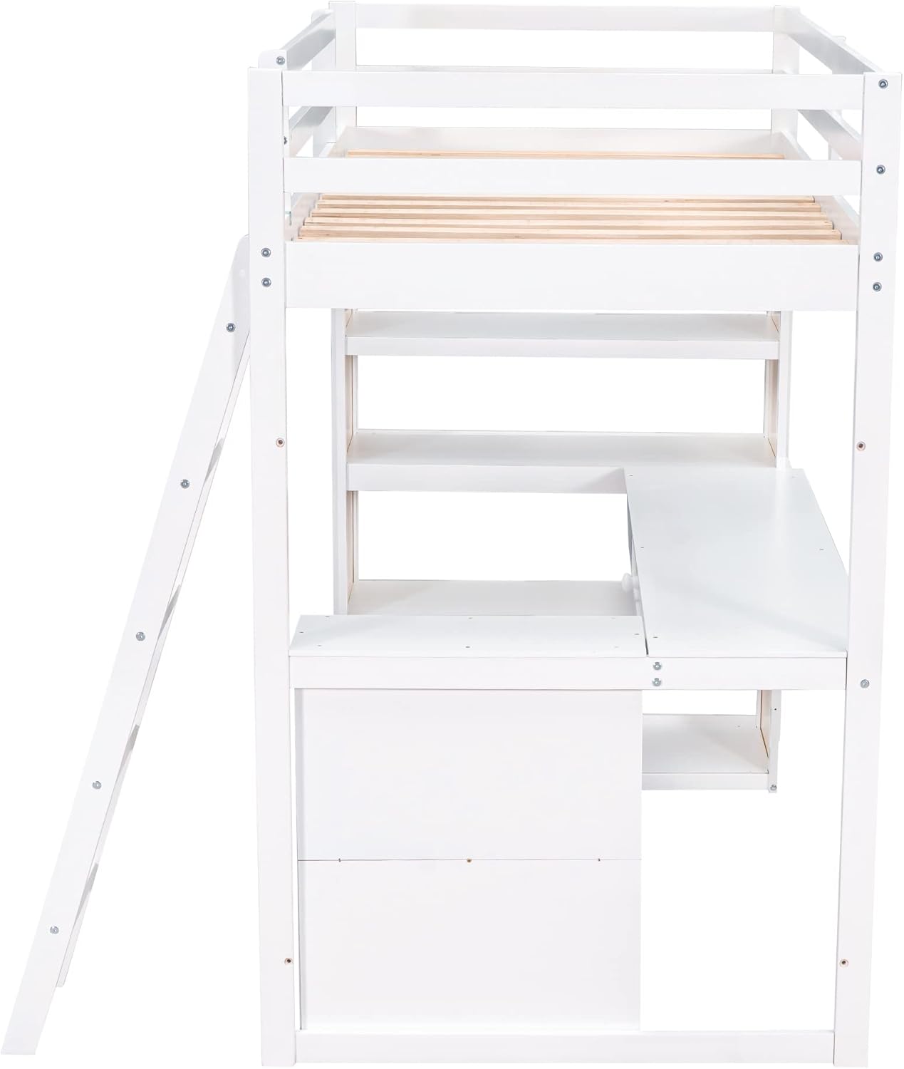 Twin Size Loft Bed with Ladder, Shelves, and Desk, White