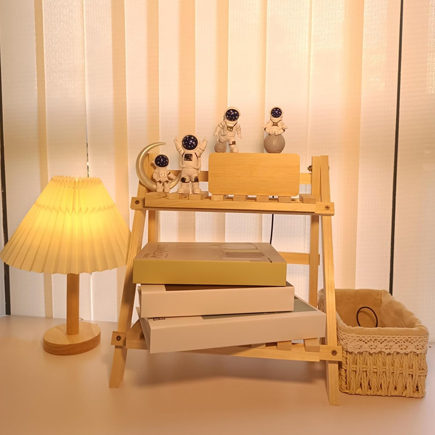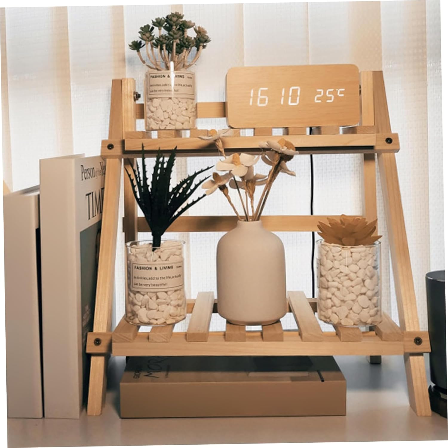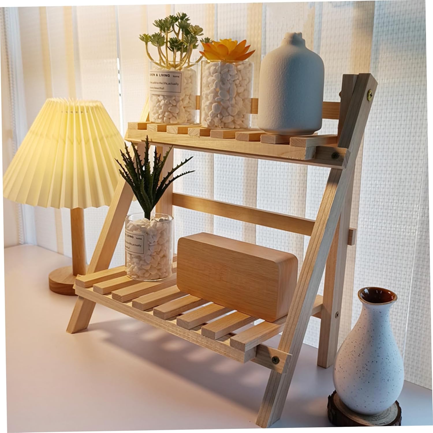 2 Tier Wooden Ladder Shelf, Table Shelf Unit Free Standing Plants Pot Stand Shelves Tabletop Wooden Display Stand Organizer for Living Room Bedroom 34x18x35cm