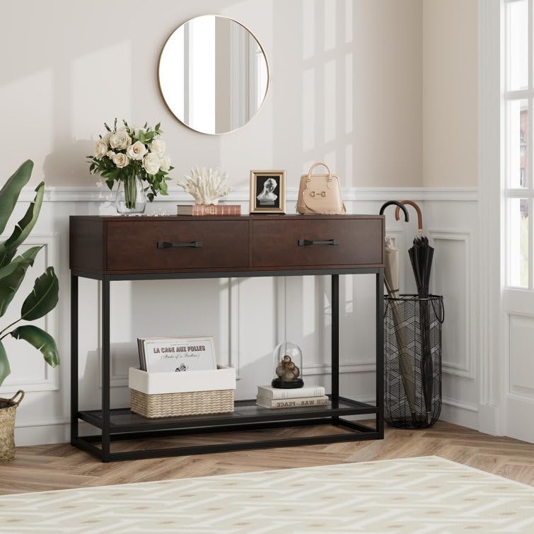 Console Table with 2 Drawers, Industrial 2 Tiers Entryway Sofa Table, Narrow Long Wood Console Table with Storage Shelves for Entryway,Living Room, Hallway. (Dark Brown)