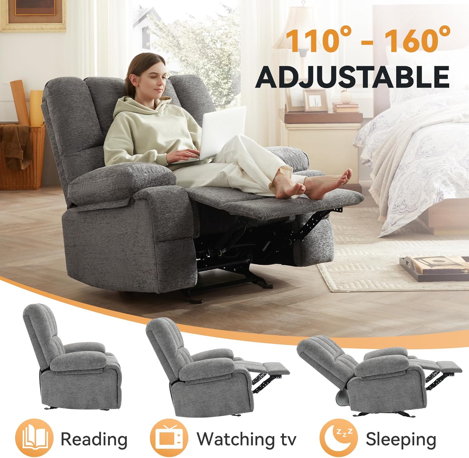 Oversize Rocker Adults, Extra Wide Manual Recliner, Comfortable Velvet Rocking Chair with Pillow Top Arms & Cushion Back Limestone, Grey